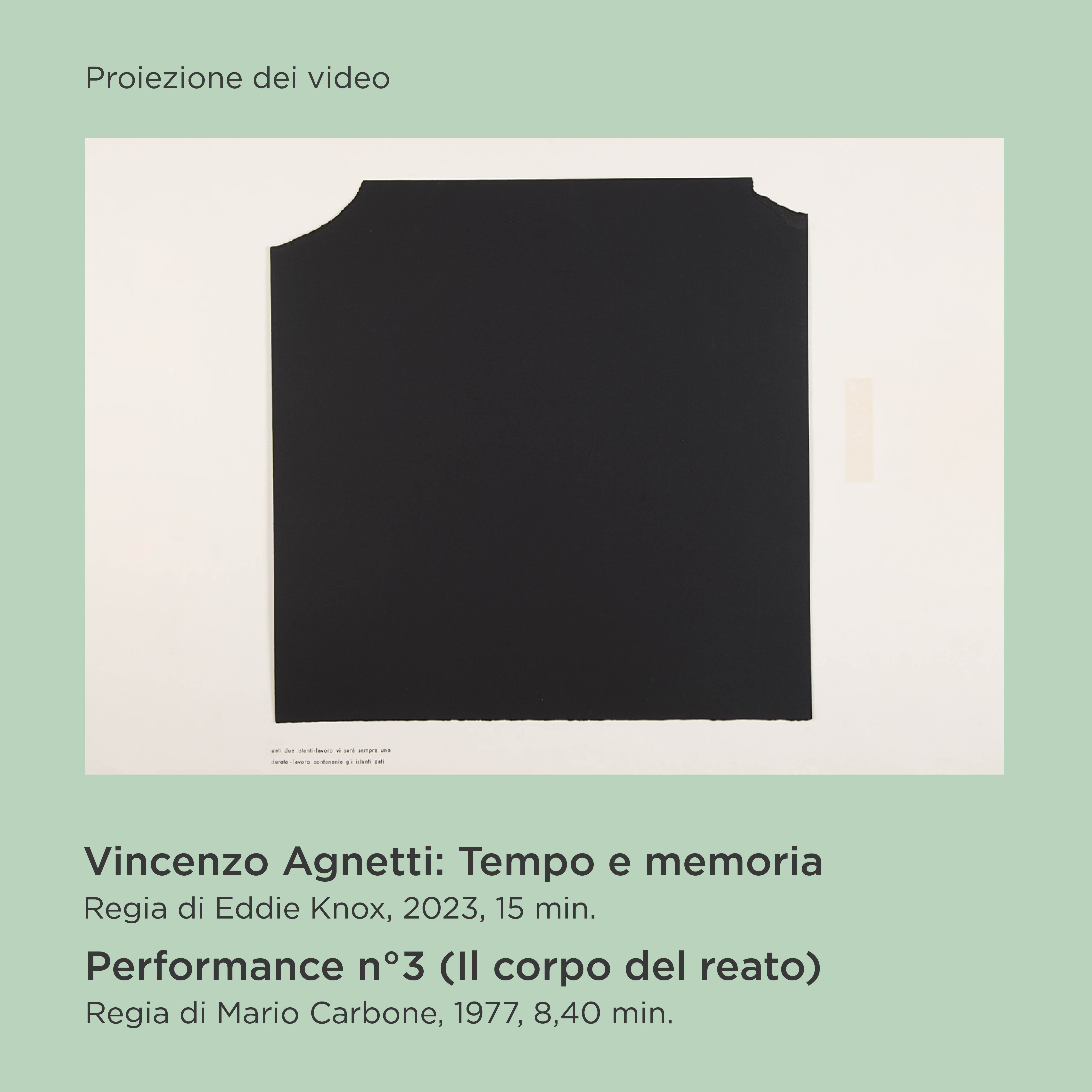 Il primo appuntamento di questa nuova stagione, in programma venerdì 17 novembre alle ore 19 presso la Sala Conferenze (Via Lungomare Trieste, 13), sarà dedicato a Vincenzo Agnetti (1926 – 1981) con la visione del documentario Vincenzo Agnetti: Tempo e memoria, e di Performance n. 3 (il corpo del reato), azione realizzata dall’artista in occasione della “Settimana Internazionale della Performance” (Arte Fiera Bologna, giugno 1977).