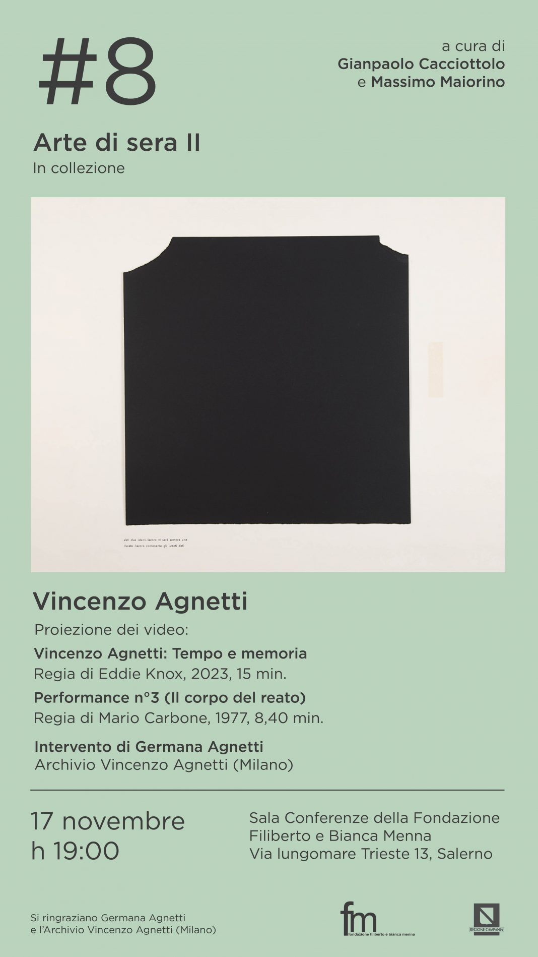 Arte di sera – In collezione, rassegna di proiezioni dedicate alle artiste e agli artisti della collezione Menna, riparte con il primo di quattro appuntamenti. La serata sarà dedicata a Vincenzo Agnetti con la proiezione di due documenti video e l’intervento di Germana Agnetti.