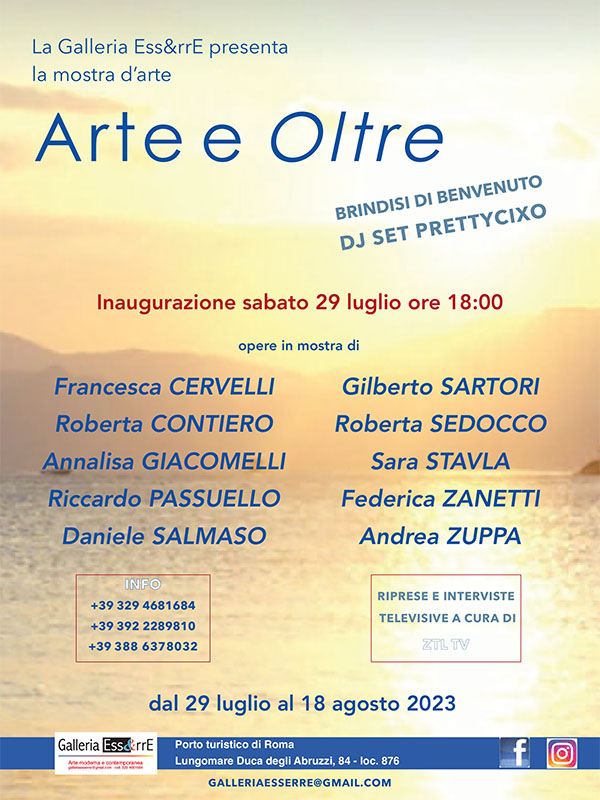 La Galleria Ess&rrE nel proseguire nella ricca programmazione artistica del 2023 propone diverse mostre di qualità indiscussa che sono all’insegna della bellezza, dell’eleganza e della virtù artistica in cui nella mostra “Arte e Oltre” con gli artisti Francesca Cervelli, Roberta Contiero, Annalisa Giacomelli, Riccardo Passuello, Daniele Salmaso, Gilberto Sartori, Roberta Sedocco, Sara Stavla, Federica Zanetti e Andrea Zuppa al Porto turistico di Roma si brinderà ad un nuovo ennesimo evento con circa 35 opere di selezionata arte. La Galleria e tutto lo staff vi introdurrà nella realtà estetica assoluta e presenteremo una nuova bellissima iniziativa in cui dieci artisti di concezione e tecniche diverse si confrontano a suon di opere anche di grande formato in cui il pubblico sarà parte integrante della mostra.