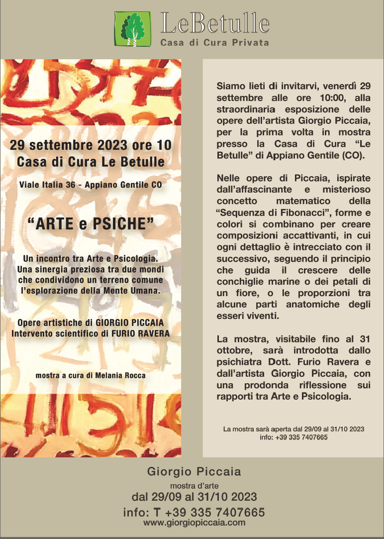 Siamo lieti di invitarvi il 29 settembre, alle ore 10:00, all’evento “Arte e Psiche” e alla straordinaria esposizione delle opere dell’artista GIORGIO PICCAIA, per la prima volta in mostra presso la Casa di Cura “Le Betulle” di Appiano Gentile (CO).