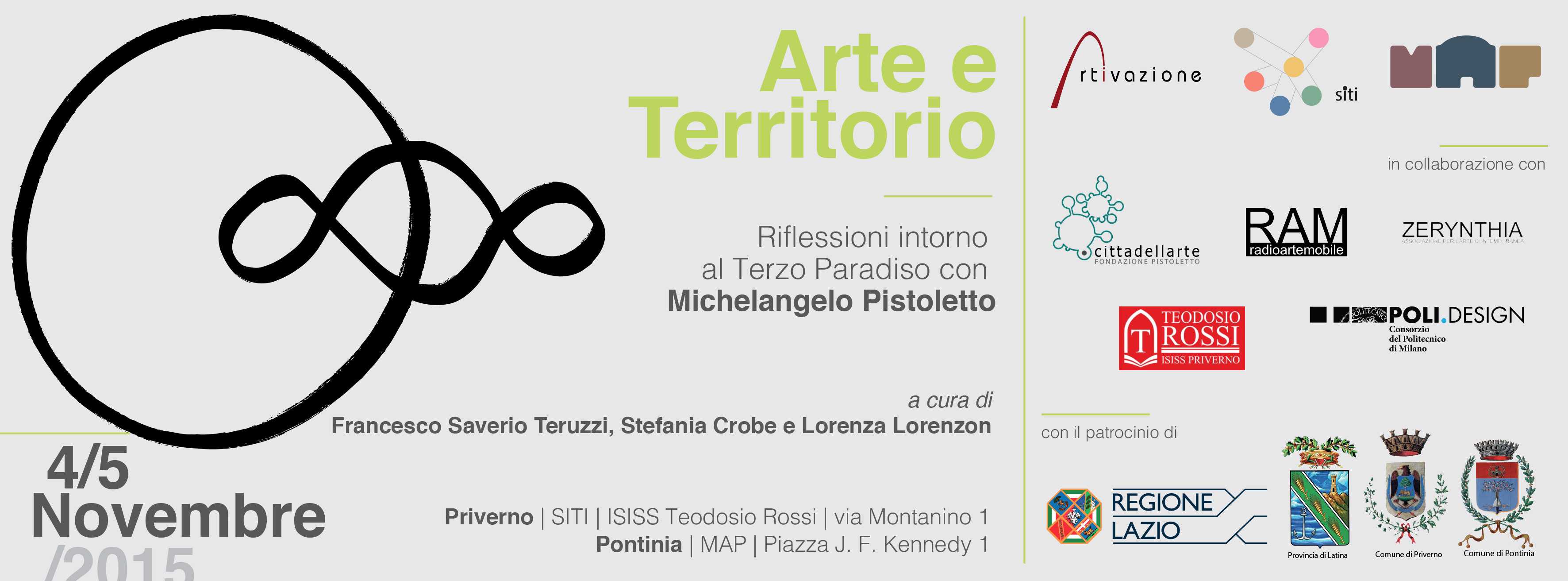 Con l’idea di far crescere il dibattito critico sul ruolo dell’arte nei processi di trasformazione dei territori e grazie alle suggestioni fornite dalla presenza eccezionale di Michelangelo Pistoletto, continua così la riflessione su Arte e Territorio di Artivazione, SITI e MAP perché, come ricorda Teruzzi «il Terzo Paradiso è un simbolo, ma anche un’occasione. Il poter indirizzare grandi azioni artistiche e piccole azioni quotidiane in un’unica direzione che incredibilmente è tutta intorno a noi. Il simbolo del Terzo Paradiso, attraverso il terzo cerchio, rappresenta il superamento di tutte le scuse: non si può semplicemente incolpare il passato né attendere passivamente un eventuale futuro, la nostra responsabilità è adesso, è presente, è il presente e non ci possiamo tirare indietro».