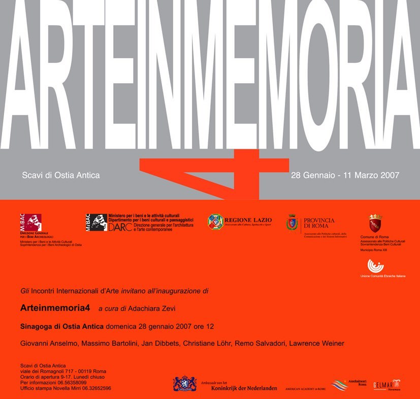 In occasione della Giornata della Memoria 2007, domenica 28 gennaio torna nella Sinagoga di Ostia Antica l’appuntamento biennale con Arte in memoria, la rassegna di arte contemporanea a respiro internazionale promossa dagli Incontri Internazionali d’Arte, a cura di Adachiara Zevi.