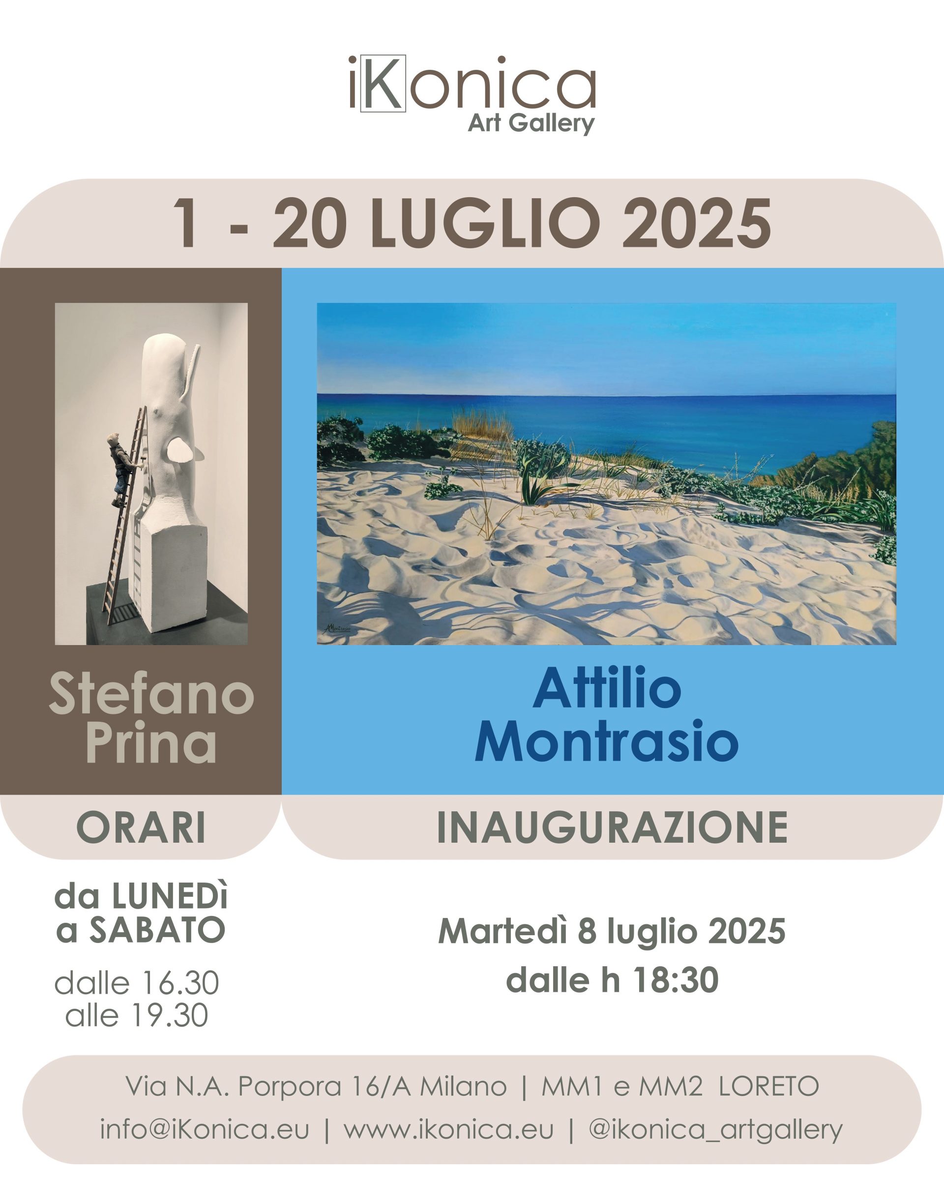 Ultimo appuntamento espositivo della stagione primavera-estate 2025 ad iKonica Art Gallery tra le spiagge di Attilio MONTRASIO e i capodogli di Stefano PRINA.