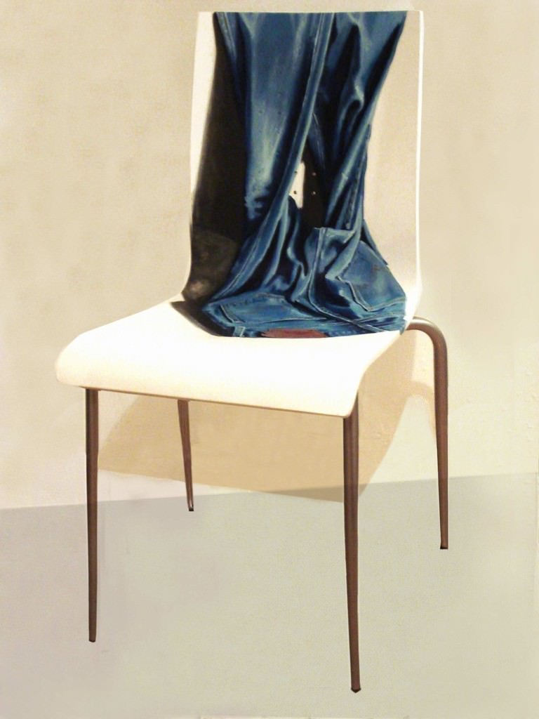 Mario Loprete questa volta ci proietta con le sue tele nel mondo criminale; volutamente candido lo sfondo della sedia impreziosita da un jeans trompe l’oeil il tutto dipinto ad olio.