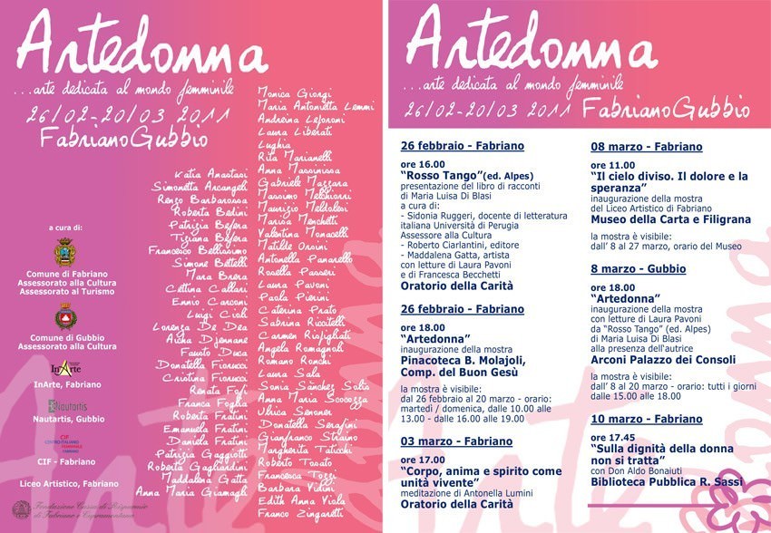 - Titolo della mostra “ArteDonna: arte dedicata al mondo femminile” – da un’idea delle due Associazioni culturali di Fabriano e Gubbio, in continuità con la manifestazione 2010 – è stato chiesto agli Artiste partecipanti di interpretare l’argomento in totale libertà intellettuale, secondo l’esperienza e la tecnica preferite da ciascuno, con l’intento di creare una marcata testimonianza del proprio percorso Artistico e di vita.