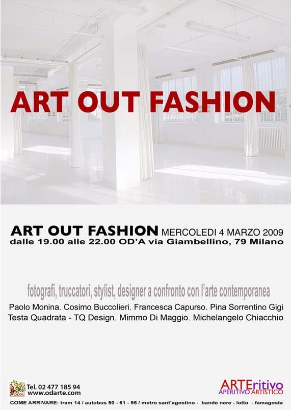Lo spazio OD’A ospita l’esposizione collettiva con Paolo Monina, Cosimo Buccolieri, Francesca Capurso, Pina Sorrentino Gigi, Testaquadra-TQ design, Mimmo Di Maggio, Michelangelo Chiacchio, persone che normalmente fanno i fotografi, truccatori, stilyst, designer, ma che in questa occasione svelano una poetica propria che mettono a confronto con l’arte contemporanea.