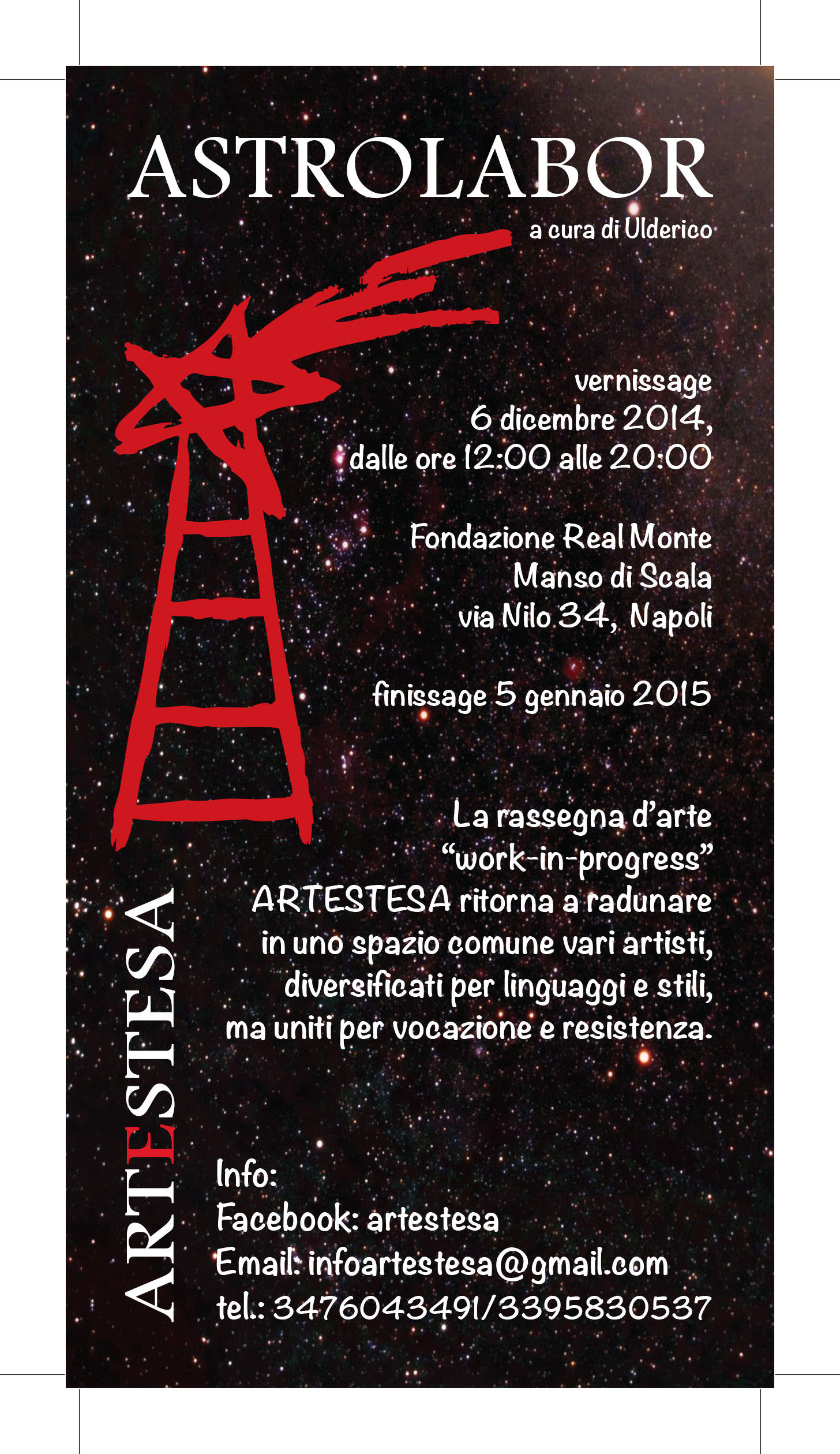 Il titolo della rassegna di quest’anno è Astrolabor, ispirato alla stella cometa, nella sua duplice accezione, come leggenda natalizia, in cui la stella è il segnale celeste sul cammino da seguire, un segnale di sostegno e speranza verso una rinascita; e come meteora, la comparsa di un potente evento cosmico, di folgorante bellezza e luminosa energia ma, fugace ed evanescente. Astrolabor evoca il filo sottile su cui cammina l’arte oggi, in bilico tra la possibilità di rinascita e il pericolo della scomparsa, lo stesso su cui sembra camminare il mondo del lavoro. Artestesa ritorna, dopo due anni, a radunare in uno spazio comune vari artisti, diversificati per linguaggi e stili, ma uniti per vocazione e resistenza.