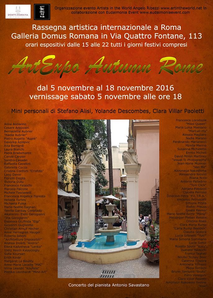 Si inaugura sabato 5 novembre alle ore 18 la rassegna artistica internazionale a Roma ArtExpo Autumn Rome, presso il prestigioso spazio della Galleria Domus Romana in Via Quattro Fontane, 113 00184 Roma tra Piazza di Spagna e la Fontana di Trevi, in centro storico di Roma.
