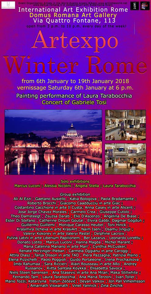 Si inaugura sabato 6 gennaio 2018 alle ore 18 la grande rassegna artistica internazionale a Roma Artexpo Winter Rome 2018, presso il prestigioso spazio della Galleria Domus Romana https://www.domus-romana.it in Via Quattro Fontane, 113 00184 Roma tra Piazza di Spagna e la Fontana di Trevi, in centro storico di Roma.