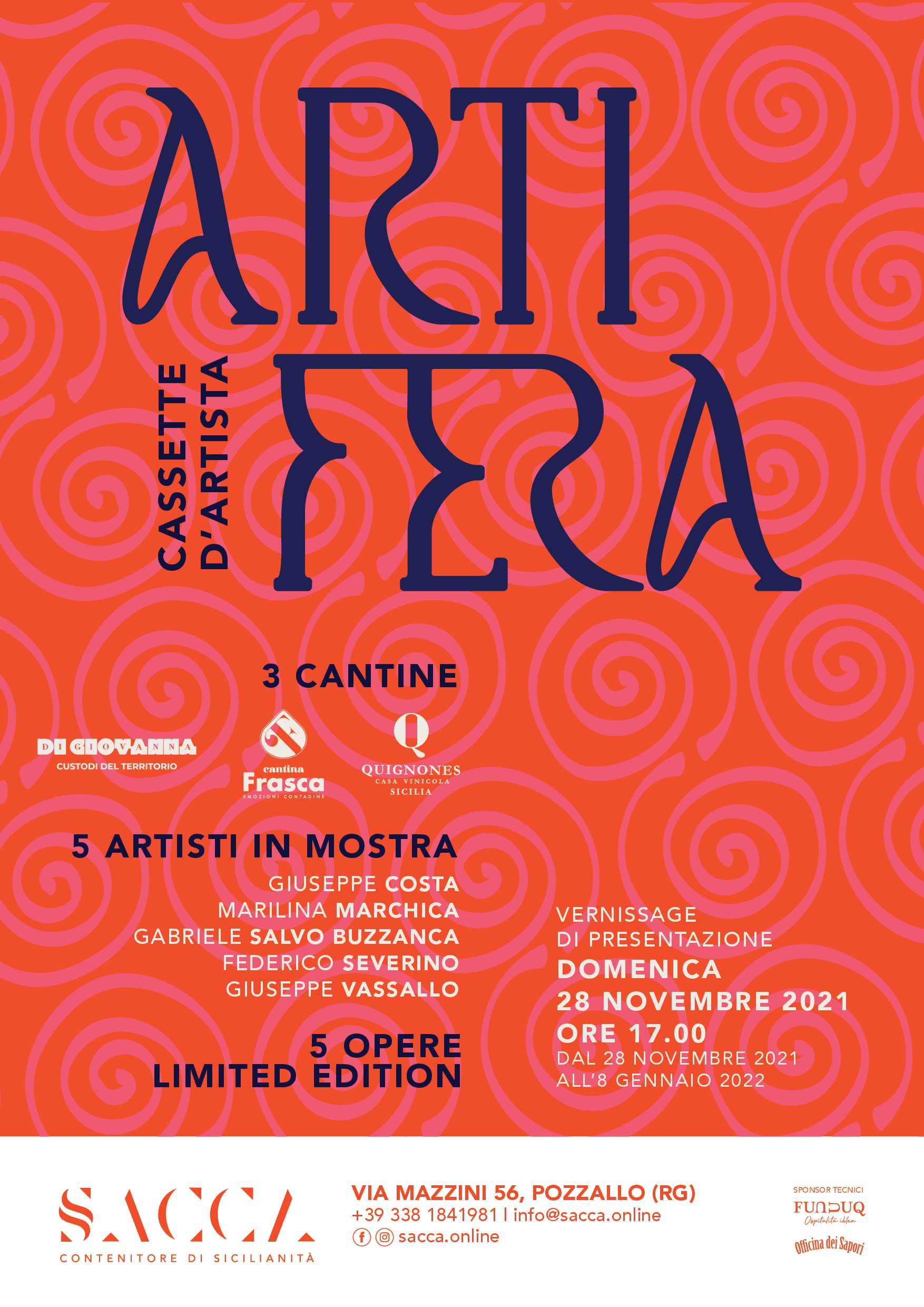 ARTIFERA è il nome di fantasia ideato per il nuovo progetto concepito dalla siciliana galleria d’arte contemporanea SACCA. Esso vedrà il via a fine novembre (il 28) e prevede il coinvolgimento di tre cantine co-finanziatrici nella realizzazione di una collezione limited edition di cassette d’artista e una mostra nella sede della galleria (a Pozzallo, nel ragusano) con opere dei cinque artisti invitati.