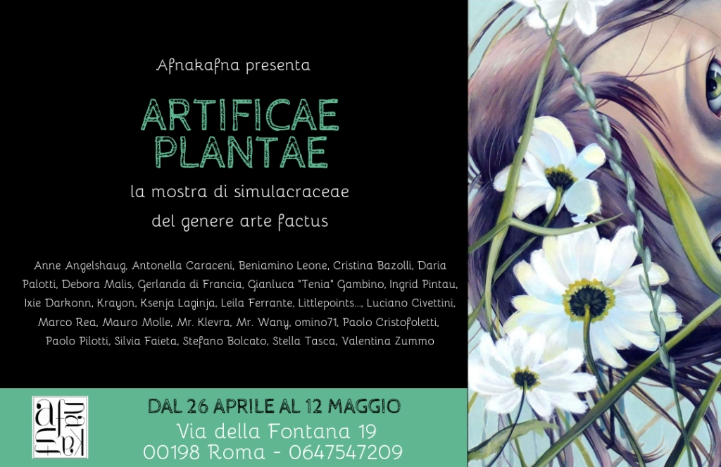 Sarà bello vedere come i nostri artisti hanno interpretato questo tema, apparentemente banale, ma che offre un universo di colori e simbologie, coniugato in modo personale. Lo incontriamo nel naturalismo di Anne Angelshaug, giovane artista norvegese, influenzato dal fumetto e dal tattoo con Mr.Wany, negli spruzzi di colore nelle oniriche immagini di Marco Rea, ritmato con precisione geometrica nell’opera di Krayon; un panorama completo e bellissimo che trasformerà la galleria Afnakafna, nuova vivace realtà romana, in una vera e propria serra dell’arte. Una serra di fiori artificiali, cioè creati ad arte, per accogliere una Primavera artistica che avrà, ce lo auguriamo tutti, lunga durata e il profumo di rinnovata energia.