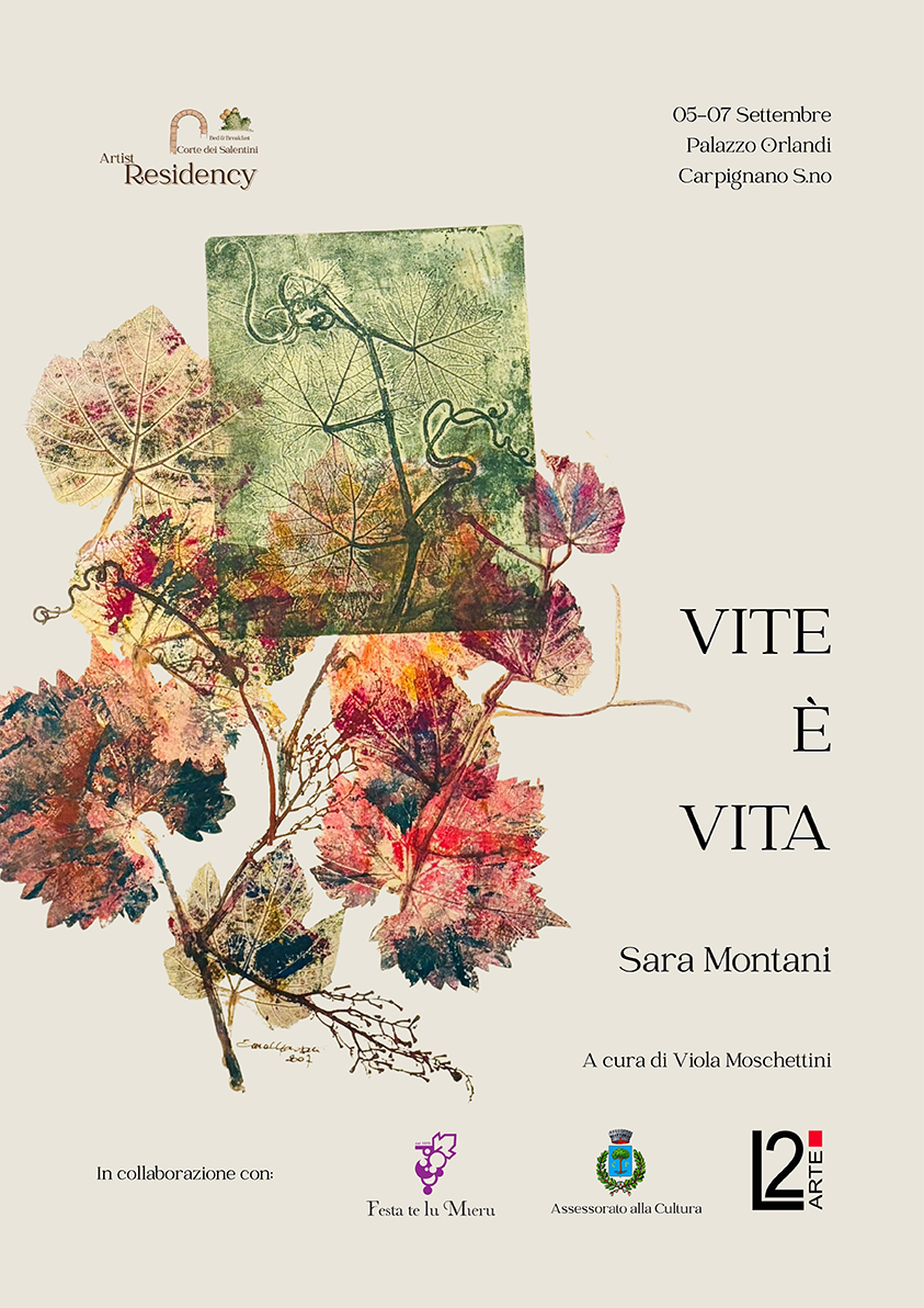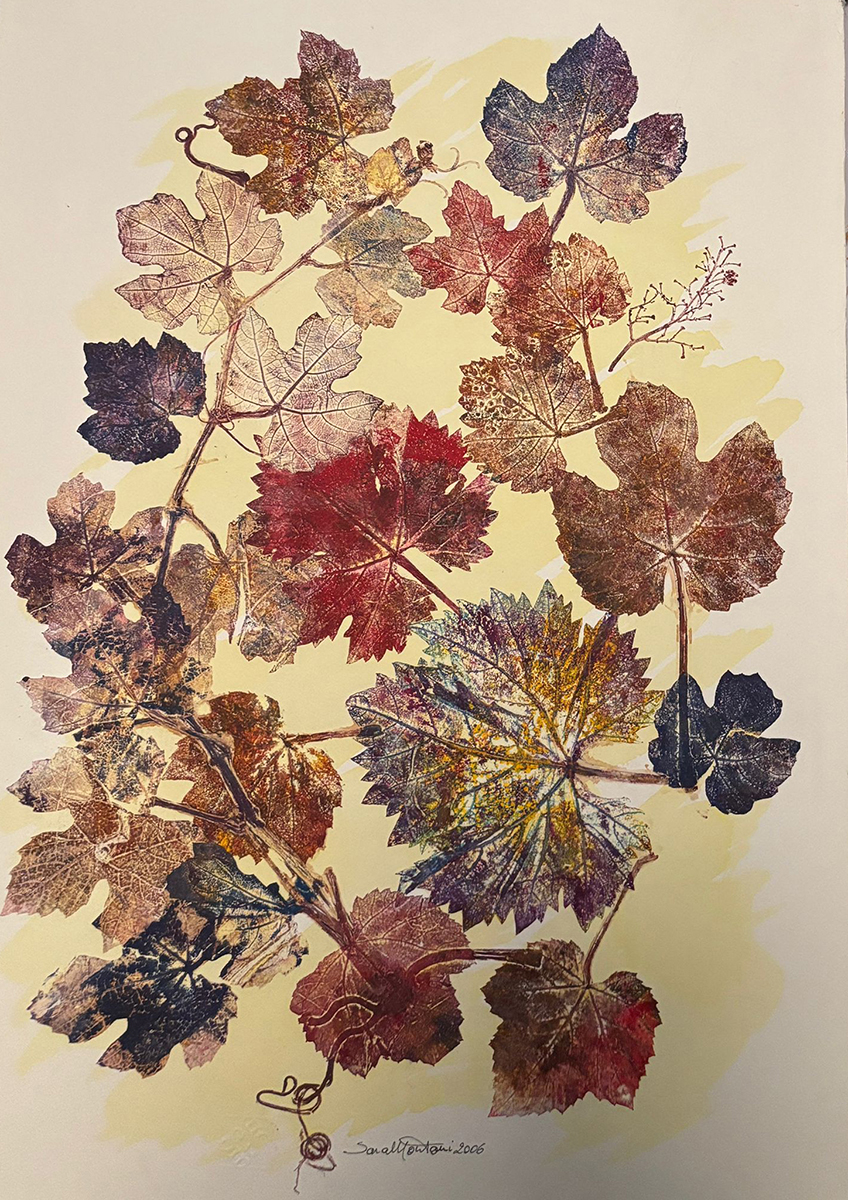 Sara Montani, Artista, progetto “Vite è vita”: attraverso opere realizzate in monoprint o con la tecnica dell’acquaforte, l’artista celebra la vite ed il legame dell’uomo con la natura. Le opere esplorano la bellezza intrinseca e la complessità delle forme botaniche. I protagonisti della collezione sono infatti foglie e rami, che divengono allo stesso tempo matrici e soggetti, dando vita a stampe calcografiche inchiostrate a monotipo e acqueforti connotate da graduali variazioni cromatiche, analizzando le differenti identità che possono essere assunte dalla medesima forma.