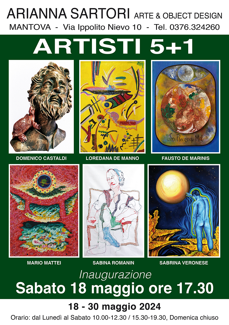La Galleria Arianna Sartori di Mantova, nella sala di via Ippolito Nievo 10, il prossimo Sabato 18 maggio alle ore 17.30, inaugura la mostra collettiva “ARTISTI 5+1”. Alle pareti sarà possibile ammirare i dipinti degli artisti: Loredana de Manno, Fausto de Marinis, Mario Mattei, Sabina Romanin, Sabrina Veronese, al centro della sala saranno collocate alcune sculture dell’artista Domenico Castaldi.