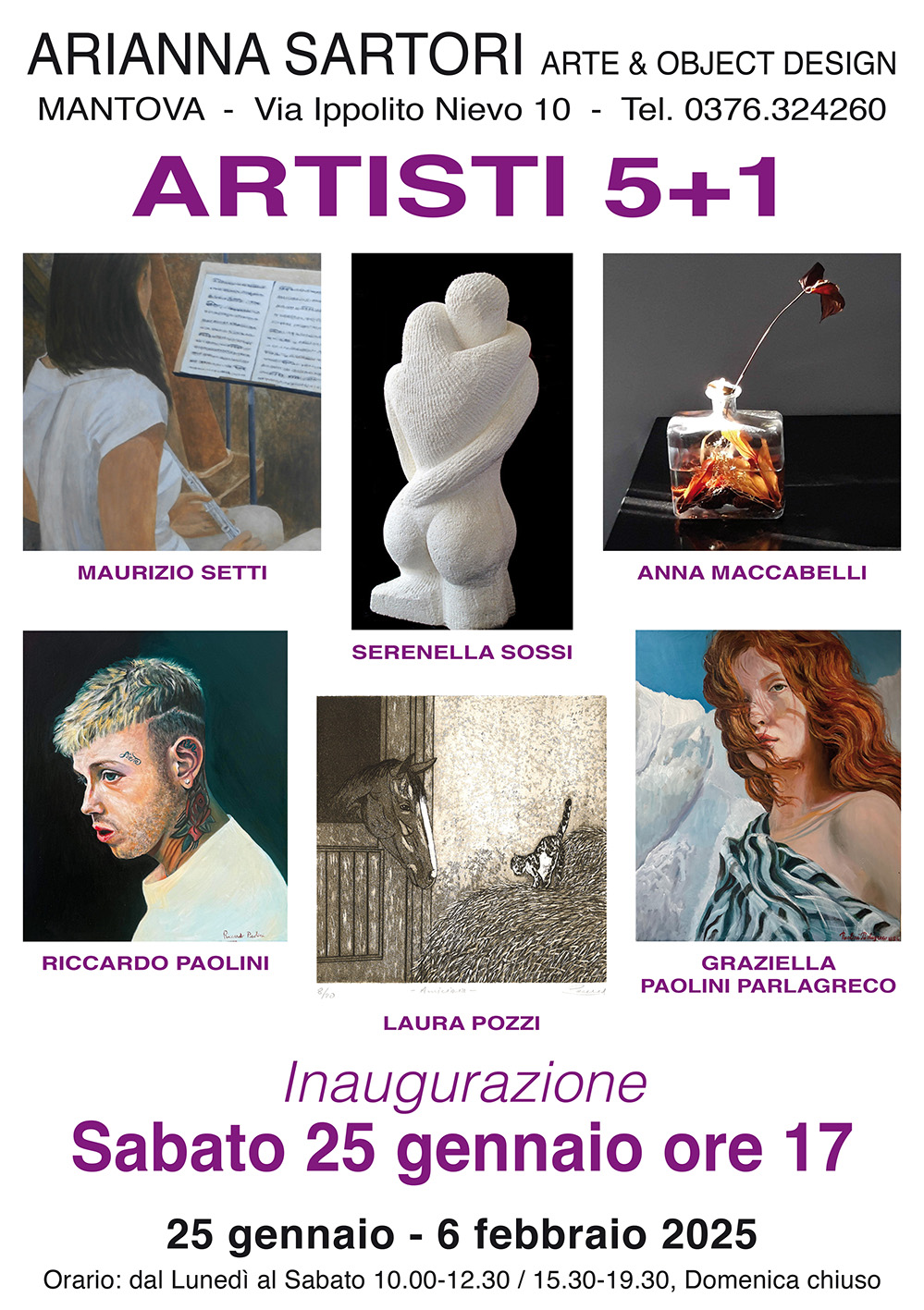 La Galleria Arianna Sartori di Mantova, nella sala di via Ippolito Nievo 10, il prossimo Sabato 25 gennaio alle ore 17.00, inaugura la mostra collettiva “ARTISTI 5+1”. Alle pareti sarà possibile ammirare le fotografie di Anna Maccabelli, i dipinti di Graziella Paolini Parlagreco, Riccardo Paolini, Maurizio Setti, le incisioni di Laura Pozzi e al centro della sala saranno collocate alcune sculture dell’artista Serenella Sossi.