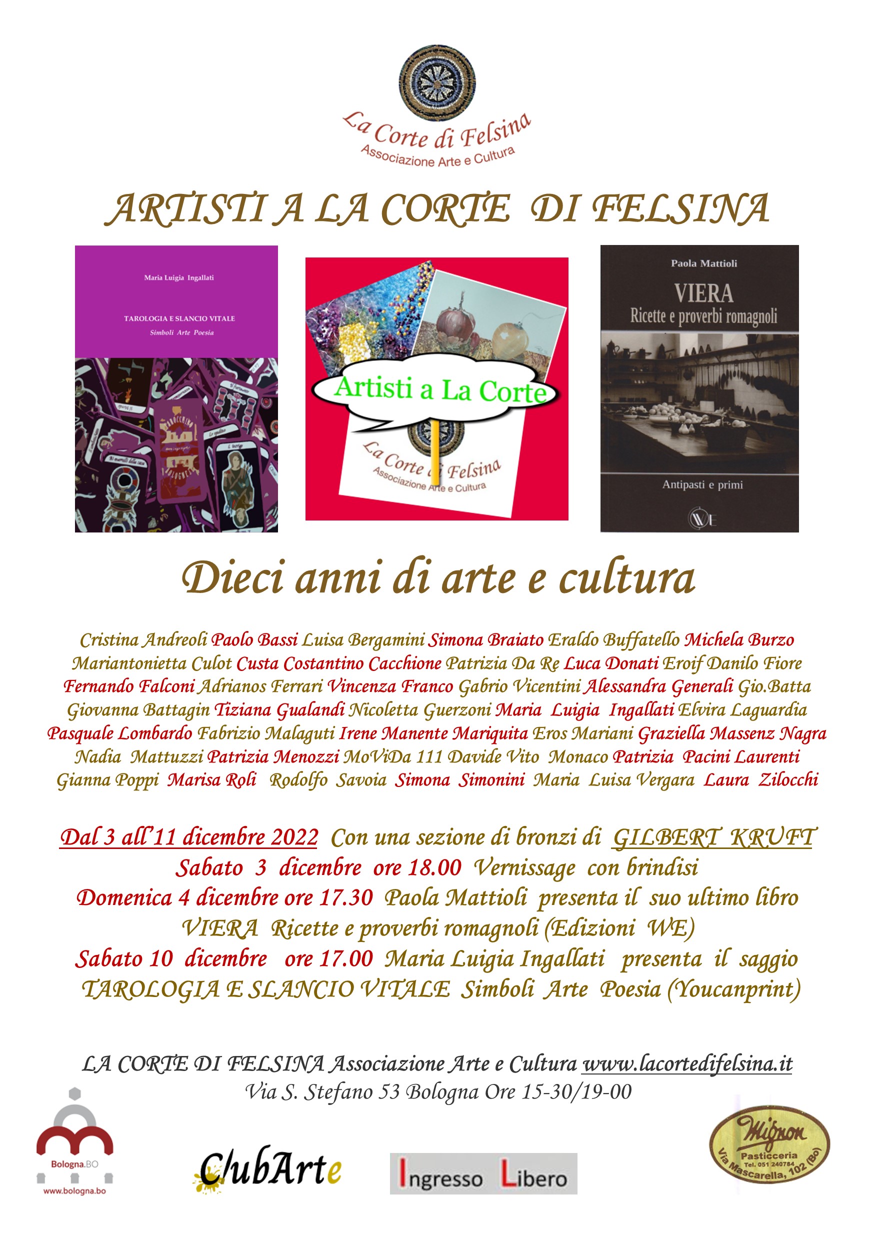 In occasione dei festeggiamenti per i dieci anni di attività di promozione artistica e culturale dell’Associazione Arte e Cultura La Corte di Felsina che ha sede nel cuore del centro storico bolognese, lo staff organizza una mostra che vedrà la presenza di quaranta artisti