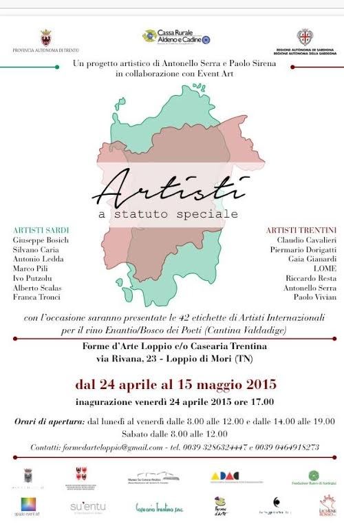 Uno spazio di incontro tra il Trentino e la Sardegna attraverso il linguaggio universale dell’arte: è questo l’obiettivo della mostra che sarà allestita presso gli spazi espositivi FORME D’ARTE LOPPIO dal collettivo di artisti “A Statuto speciale”, un progetto di Antonello Serra e Paolo Sirena. Dal 30 maggio al 28 giugno verranno esposte le opere di artisti sardi e trentini: Giuseppe Bosich,