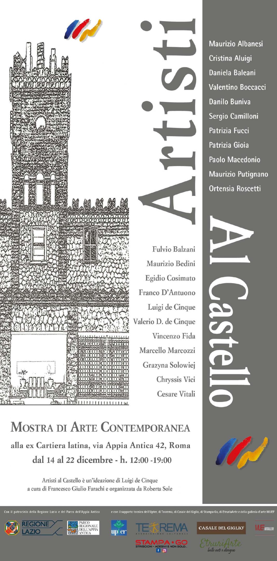 Sabato 14 dicembre p.v., alle ore 17.00, si inaugura presso la “sala Nagasawa” nell’ex-Cartiera Latina la mostra “Artisti al Castello”. L’esposizione, nata da un’idea di Luigi de Cinque, è curata da Francesco Giulio Farachi ed è messa in opera grazie alla collaborazione dell’UPTER – Università Popolare di Roma; vanta inoltre il patrocinio della Regione Lazio e del Parco Regionale dell’Appia Antica e il supporto dell’Associazione Culturale “Teorema”.