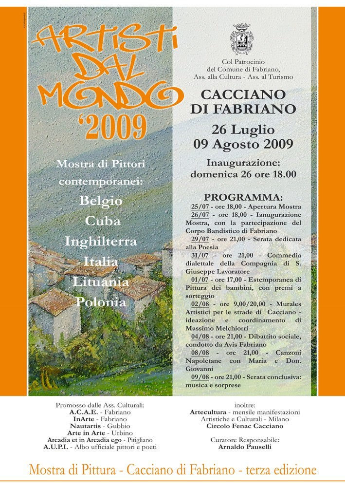 Per iniziativa del Circolo Fenac di Cacciano, col Patrocinio del Comune di Fabriano, della Fondazione Cassa di Risparmio di Fabriano, con il prezioso coordinamento dell’Ass. Culturale Nautartis di Gubbio ed InArte di Fabriano; dal 25 luglio al 09 agosto si terrà la terza edizione della Manifestazione “Artisti dal Mondo 2009”.