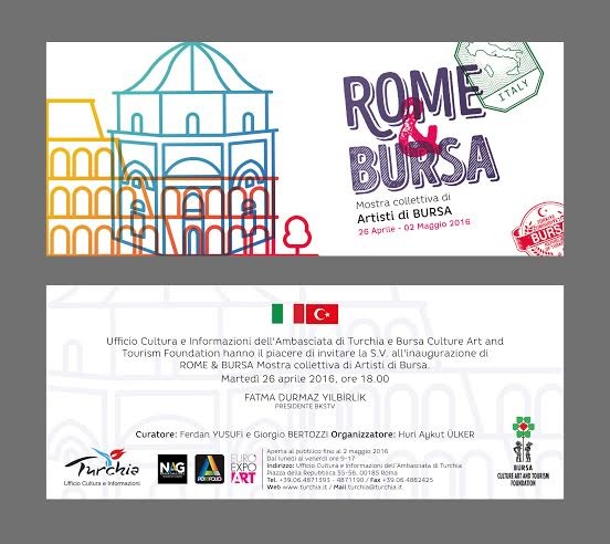 La Fondazione per la Cultura, l’Arte e il Turismo di Bursa presenta la mostra collettiva "Artisti di Bursa a Roma” che si terrà dal 26 aprile al 2 maggio 2016, in collaborazione con l’Ufficio Cultura e Informazioni dell’Ambasciata di Turchia.