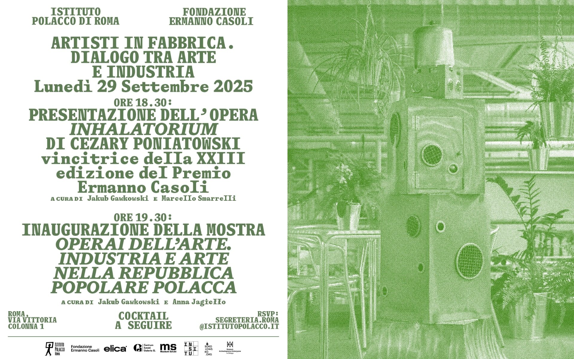 La serata, organizzata dall’Istituto Polacco di Roma, prevede l’incontro con l’artista Cezary Poniatowski, e la presentazione dell’opera Inhalatorium realizzata in occasione della XXIII edizione del Premio Ermanno Casoli, promossa dalla Fondazione Ermanno Casoli e da Elica S.p.a., creata con il coinvolgimento attivo dei dipendenti di Elica e inaugurata a giugno 2025 nello stabilimento di Elica Group Polska a Jelcz-Laskowice, in Polonia, in occasione del suo ventesimo anniversario.