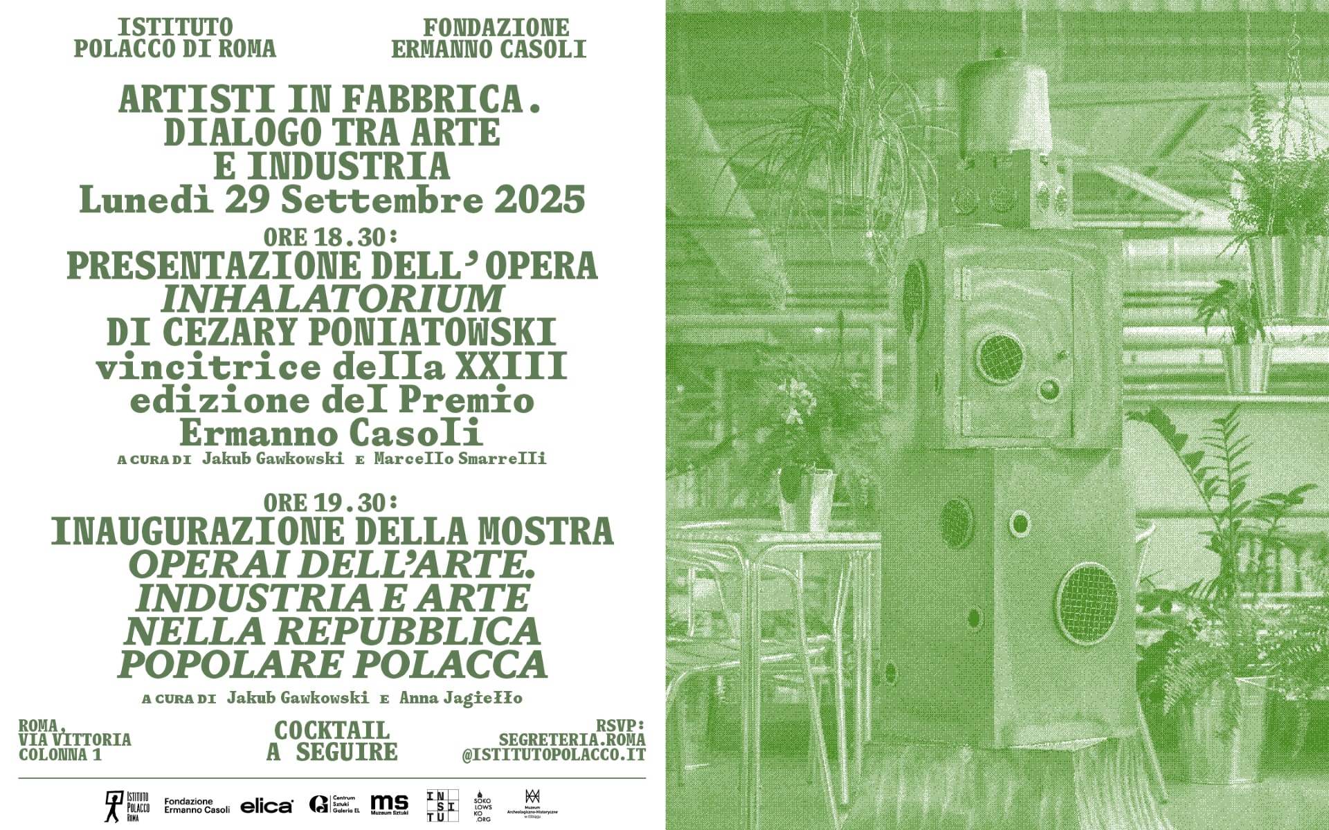 Lunedì 29 settembre 2025 dalle ore 18.30 presso l’Istituto Polacco di Roma si terrà l’evento Artisti in fabbrica. Dialogo tra arte e industria che affronterà questo tema attraverso esempi attuali e storici.