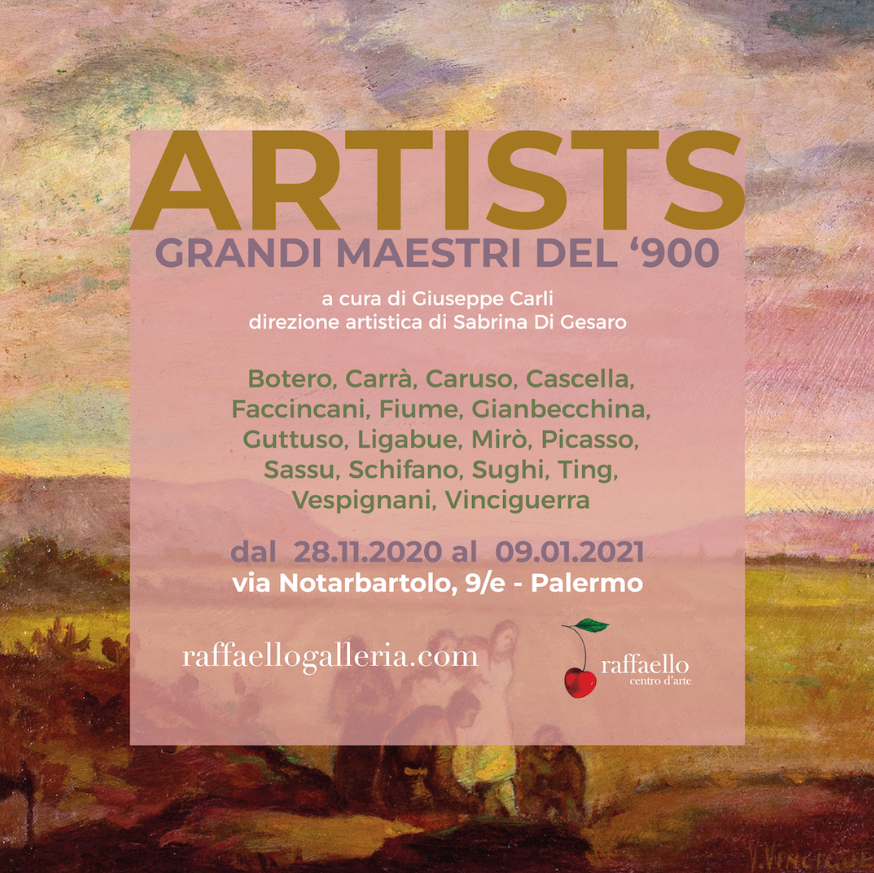 Il Centro d’arte Raffaello, diretto da Sabrina Di Gesaro, in prossimità delle festività natalizie offrirà al pubblico una collettiva di grande pregio, a cura del critico d’arte Giuseppe Carli, dal titolo “ARTISTS” e riunirà opere uniche e grafiche di grandi artisti appartenenti alle più importanti correnti del ‘900 come: Botero, Carrà, Caruso, Cascella, Faccincani, Fiume, Gianbecchina, Guttuso, Ligabue, Mirò, Picasso, Sassu, Schifano, Sughi, Ting, Vespignani, Vinciguerra. L’esposizione avrà inizio sabato 28 novembre ore 18:00 negli spazi di via Notarbartolo 9/e a Palermo