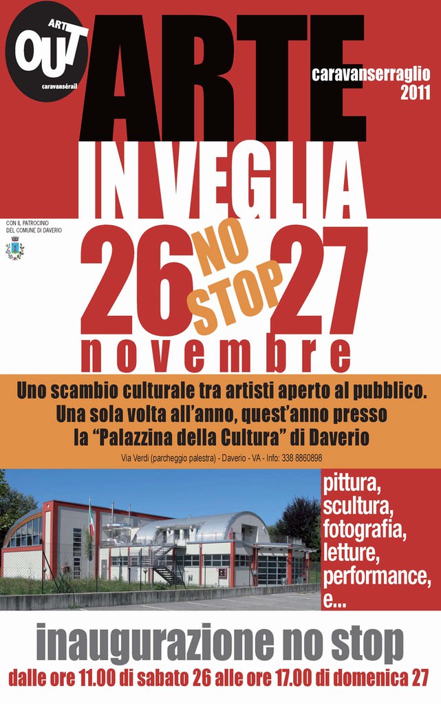 All’interno della nuova e meravigliosa Palazzina della Cultura a Daverio, gli artisti partecipanti allestiranno con le proprie opere il loro spazio e già questa operazione è parte dell’evento che sarà inaugurato alle ore 11.00 del 26 novembre e continuerà per tutta notte sino alle ore 17.00 di domenica 27. Gli artisti daranno vita ad un vero e proprio incontro caratterizzato dalla spontanea necessità di scambiarsi esperienze artistiche, opinioni, dolci ed emozioni.