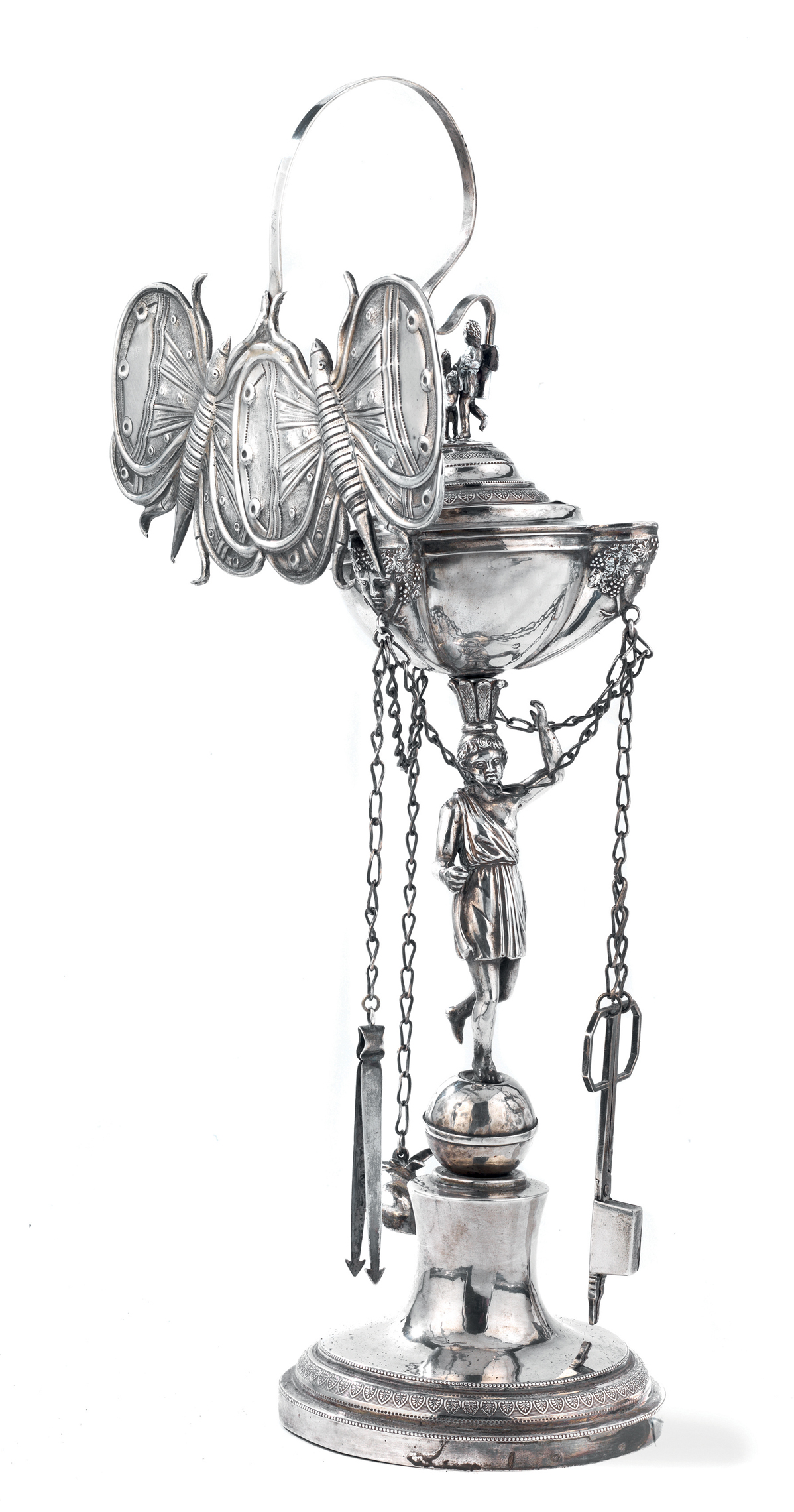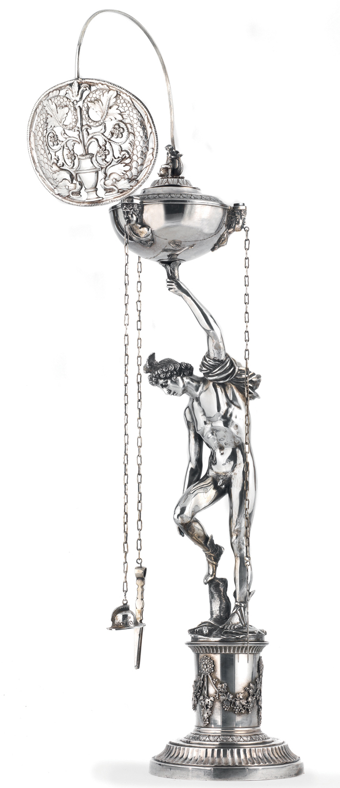Poi due LUCERNE romane: una piccola con il fusto a giovinetto in abiti classici e una coppia di farfalle a formare la ventola creata dall’argentiere Stefano Sciolet e, in contrasto, una imponente con fusto a figura di Mercurio di Gioacchino Belli. Le due luci capitoline sono in catalogo rispettivamente a 2.500/3.500 e 10.000/15.000 euro.