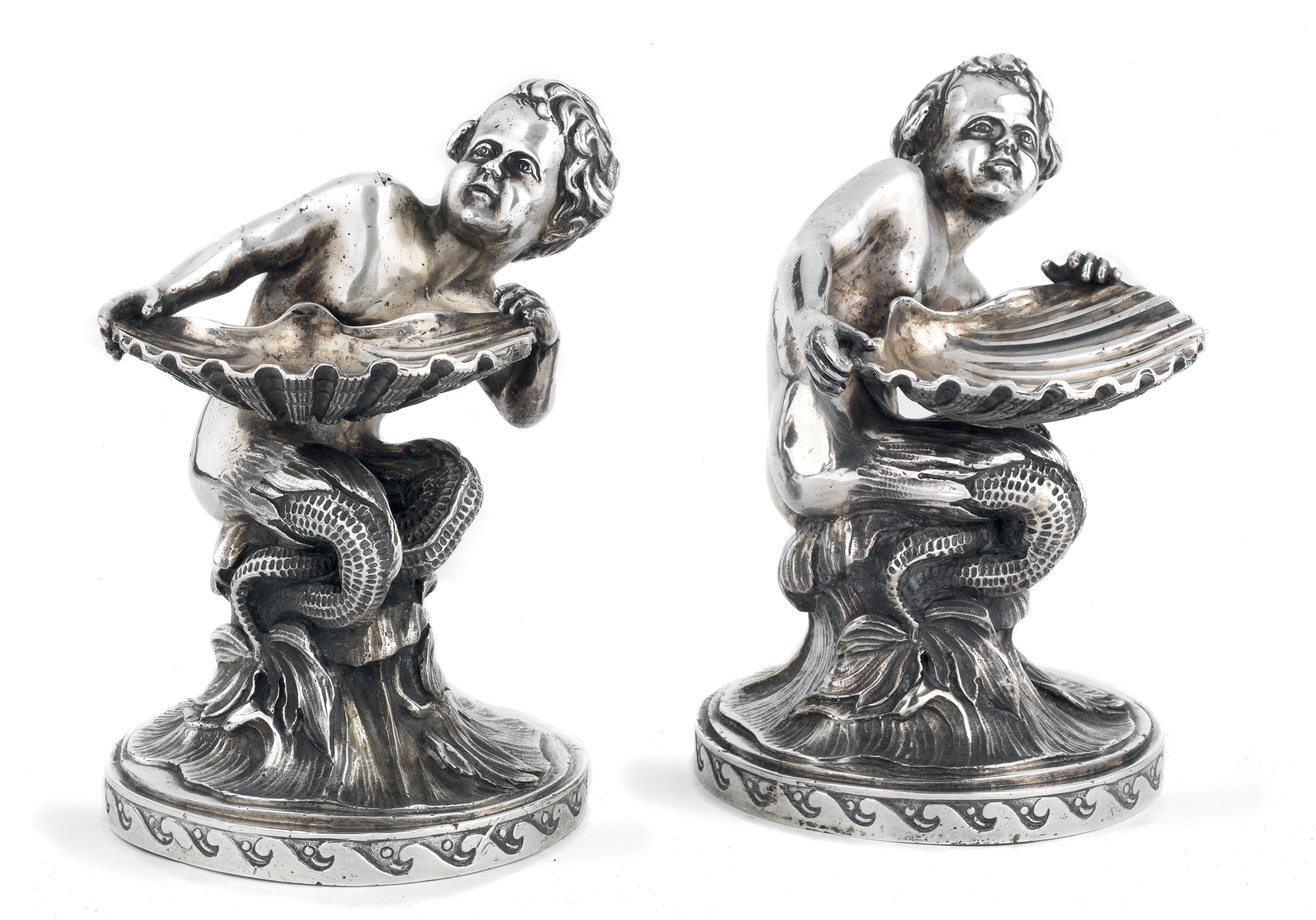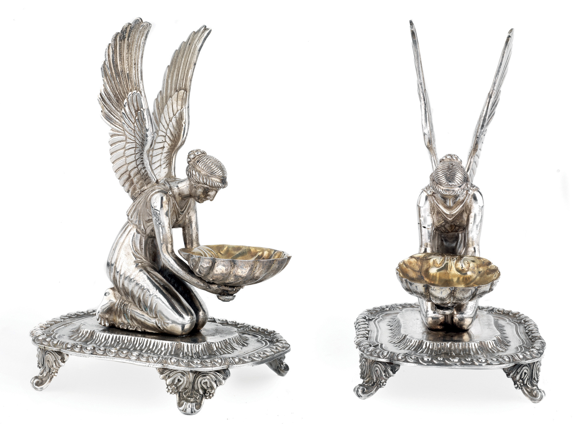 L’argento di Belli proviene da una collezione fiorentina alla quale appartengono anche tre coppie di monumentali SALIERE, due create da Jean-Baptiste-Claude Odiot, l’argentiere parigino per eccellenza nel periodo napoleonico; in una coppia la saliera è rette da una figura femminile alata inginocchiata su base rettangolare, nell’altra è dorata e poggia su una base rocciosa, entrambe sono stimate 3.000/4.000 euro. È, invece, di 2.500/3.500 euro la richiesta per la terza coppia, in cui la conchiglia porta sale è sorretta da una figura di putto con coda di pesce, realizzata del fiorentino Scheggi, uno degli orafi più importanti della città gigliata.