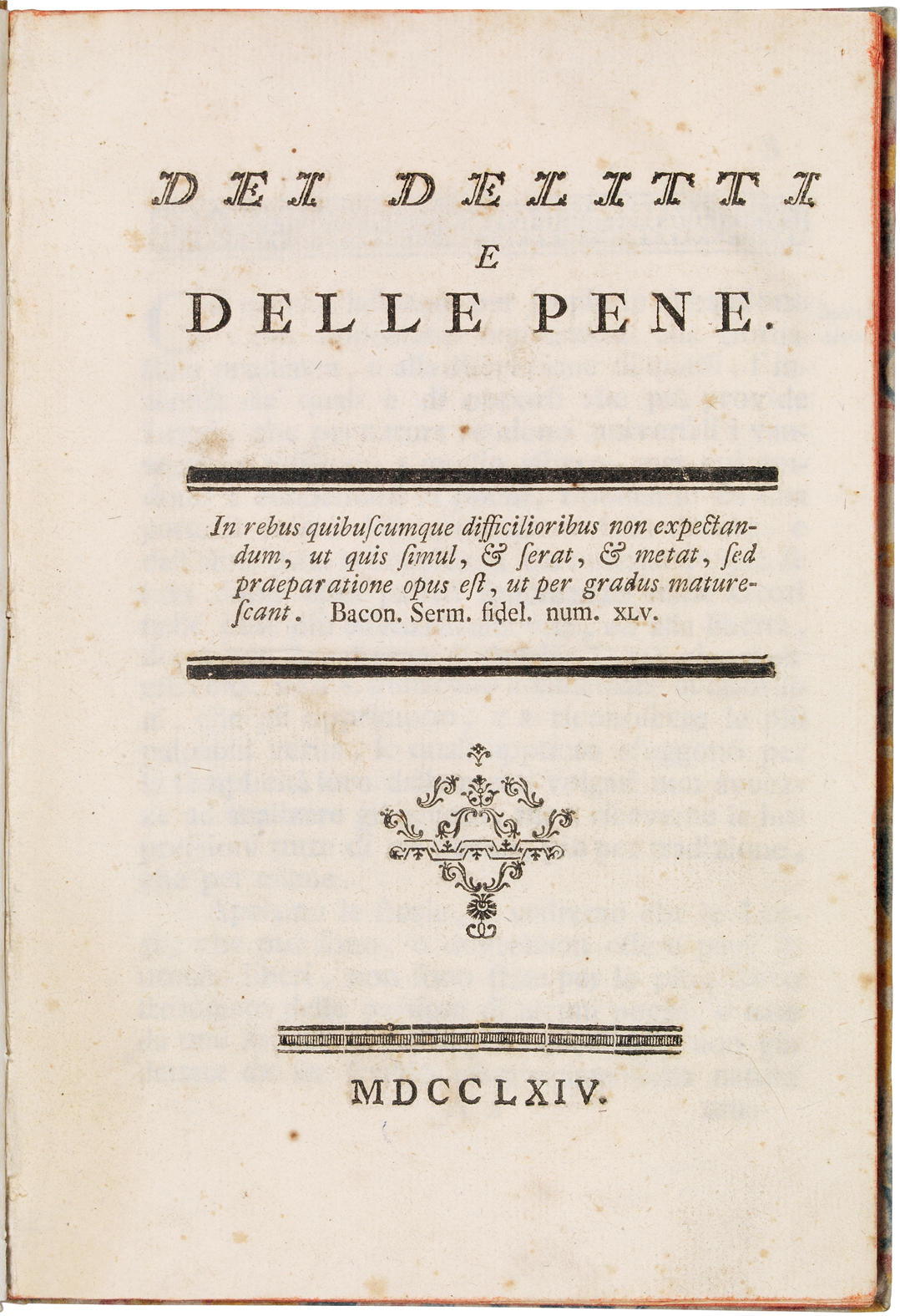Di un altro grande milanese, Cesare Beccaria, presentiamo una prima edizione del suo famoso DEI DELITTI E DELLE PENE del 1764, in asta a 7.000/9.000 euro.