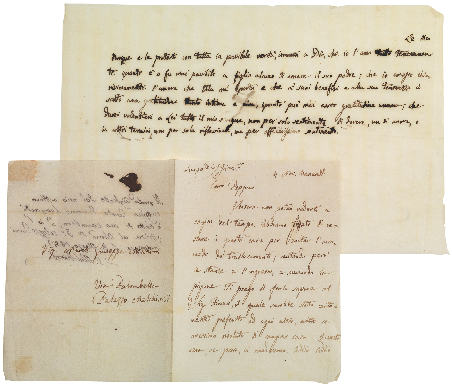Del più amato poeta italiano dell’Ottocento, Giacomo Leopardi, Chiara Nicolini, capo dipartimento, è felice di poter offrire al suo pubblico un notevole insieme di “CARTE LEOPARDIANE”, ovvero documenti a lui relativi che includono due suoi autografi, diciassette lettere della sorella Paolina tra cui quella, disperatissima, che annuncia la morte del Poeta, oltre a lettere del padre Monaldo, dei fratelli e degli amici più vicini, nonché di studiosi e personalità varie. Il ricco e interessante gruppo leopardiamo ha una valutazione di 7.600/11.400 euro.