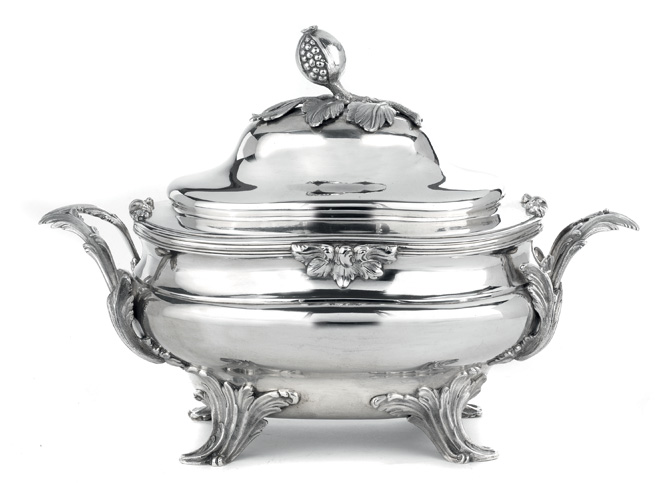 Un range leggermente più ampio, 4.000/6.000 euro, è la valutazione della bella ed elegante zuppiera realizzata negli stati sabaudi nel corso del XIX secolo, il corpo ovale poggia su quatto piedini in forma di foglie così come le anse, mentre la presa sul coperchio è una piccola e beneaugurante melagrana.