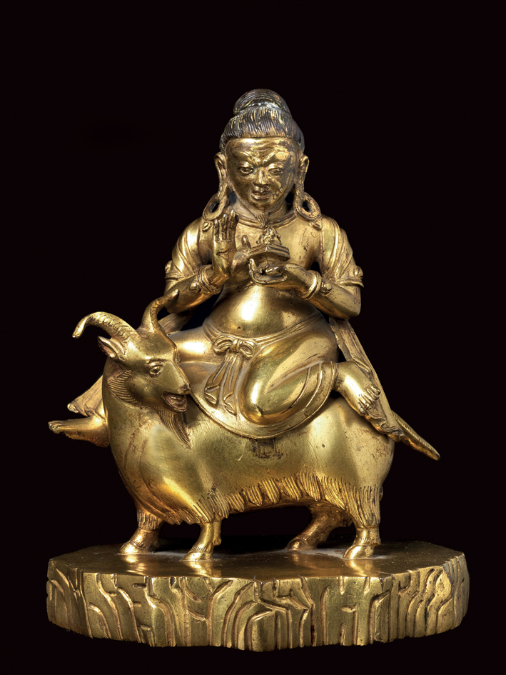 Tra i 205 che compongono il catalogo e che fanno parte della collezione di cui sopra, troviamo diversi bronzi, tra questi una SCULTURA tibetana del XVII-XVIII secolo raffigurante AGNI, il dio del fuoco che, a cavallo di una capra, regge nella mano sinistra una piramide contenente il fuoco. L’opera, realizzata in bronzo dorato e acquistata presso la Galleria Eskenazi, ha una valutazione di 4.000/6.000 euro.