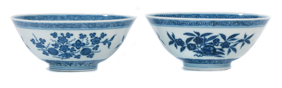 La terza ultima COPPIA DI CIOTOLE è da ascrivere alla dinastia Qing con marchio e periodo Qianlong (1736-1796), e presenta una bella decorazione di fiori e rami ming style in bianco e blu.