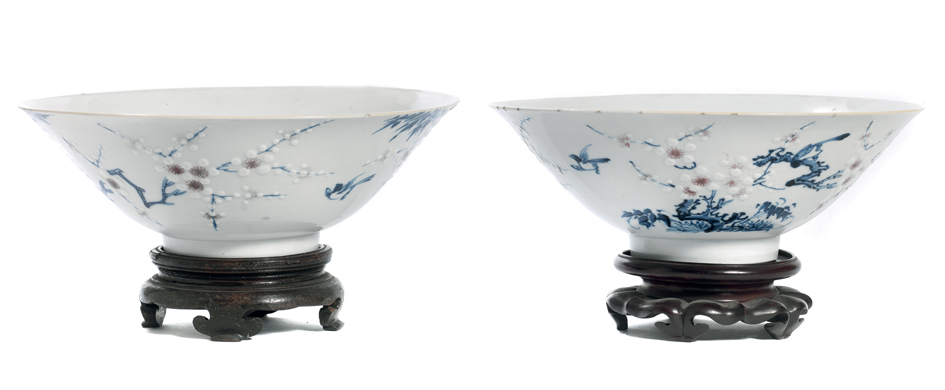 Partiamo con la COPPIA DI CIOTOLE più antica realizzata durante il periodo Kangxi (1661-1722) che è decorata da rami fioriti, dove i rami sono in blu sotto smalto così come i pistilli rosso ferro, mentre i fiori sono bianchi a rilievo. Un modello e una decorazione che rimandano a un altro esemplare conservato ad Amsterdam nella collezione del Rijksmuseum.
