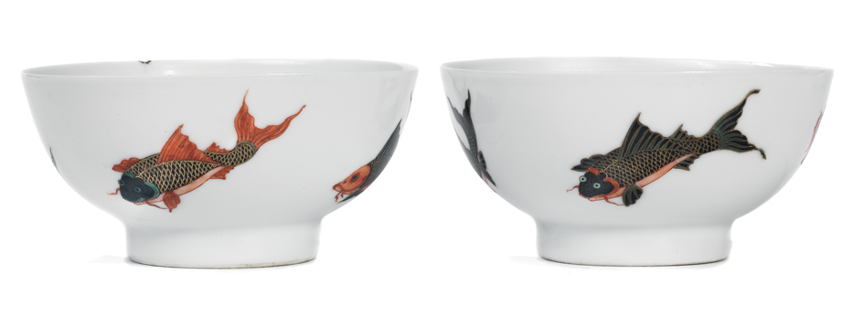 Dinastia Qing e periodo Kangxi (1661-1722) anche per la seconda COPPIA DI CIOTOLE, queste hanno una forma molto lineare, al compenso una preziosa decorazione di guizzanti pesci dai colori vivaci e riflessi d’oro e, sotto la base, un simbolo ben augurale.