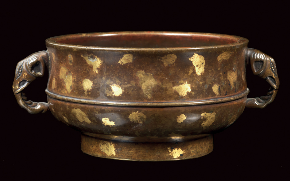 Moderno grazie al decoro gilt splashed, spruzzi d’oro sparsi sulla superfice bronzea, anche se molto antico è l’INCENSIERE di forma globulare schiacciata decorato da una fascia in rilievo e da due manici in forma di teste d’elefante. Realizzato in Cina nel corso della Dinastia Qing a cavallo tra i secoli XVII e XVIII, l’incensiere è offerto a 3.000/5.000 euro.