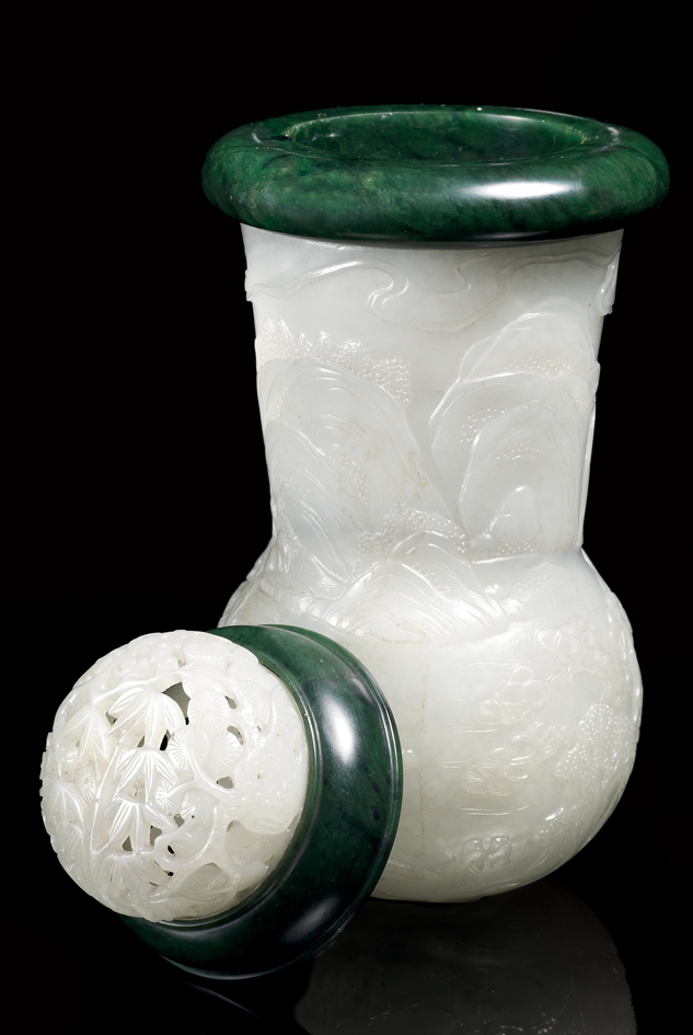 Originale per noi occidentali, ma consueto e ricco di tradizione per i cinesi, è possedere un grillo, nutrirlo e custodirlo con grande cura e attenzione, pratiche per le quali erano create apposite “gabbiette”. In asta si propone un PORTAGRILLI in giada bianca decorata da un paesaggio, con il coperchio lavorato a traforo con motivi di fiori e foglie. Questo curioso quanto raffinato oggetto, che è parte della collezione Gian Maria Buccellati, è in catalogo per la cifra di 6.000/8.000 euro.