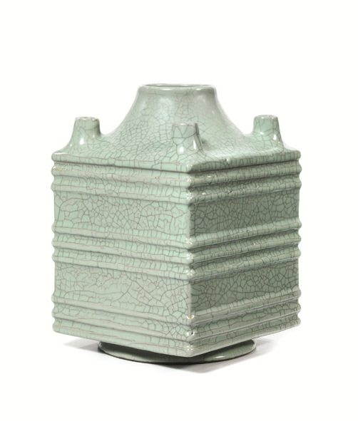 Il vaso, coperto da uno spesso smalto grigio pallido con una craquelé ben evidente a maglie strette in un tono di grigio-marrone dorato ottenuta intenzionalmente, ha sezione quadrata ed è percorso orizzontalmente da tre fasce ognuna composta di tre “creste” in rilievo; al centro un collo strombato con un’ampia bocca, ai quattro angoli altrettante piccole imboccature di forma circolare. Il piede è ad anello.