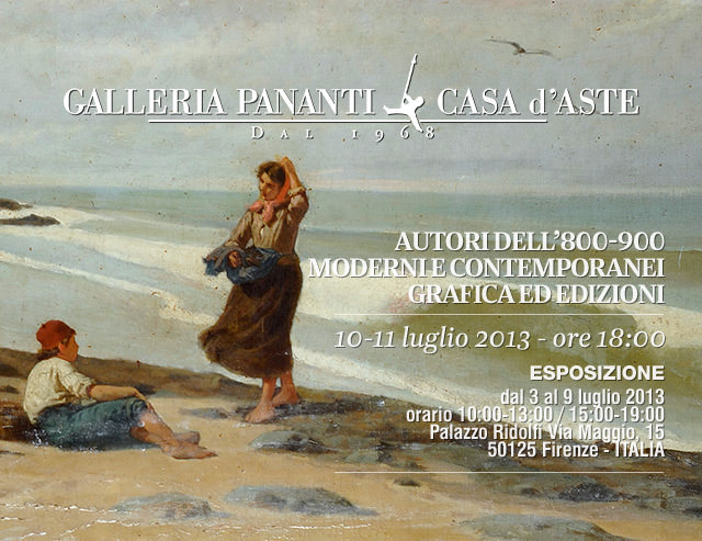 La Casa d’Aste Galleria Pananti organizza per mercoledì 10 e giovedì 11 luglio 2013 alle ore 18.00, nella sua sede di Palazzo Ridolfi (Via Maggio, 15), due sessioni d’asta di opere di autori del’800 e 900, moderni e contemporanei, Grafica ed Edizioni. L’esposizione delle opere si terrà da mercoled