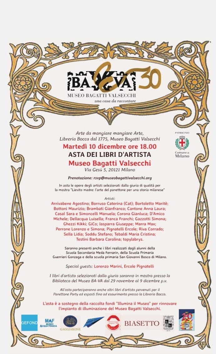 Proseguono dopo il grande successo di domenica 17 novembre i festeggiamenti del 25° Panettone Party, il prossimo attesissimo appuntamento è fissato per martedì 10 dicembre p.v. alle ore 18.00 presso il Museo Bagatti Valsecchi dove avrà luogo l’asta dei libri d’artista selezionati dalla giuria.