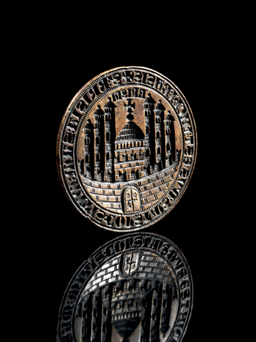 La scritta BRISIA anzichè BRIXIA compare sui grossi d'argento nella monetazione bresciana dall'epoca della Pace di Costanza fino alla signoria di Pandolfo Malatesta, agli inizi del ‘400. Il gran sigillo, il più prestigioso della storia cittadina, è opera di eccezionale qualità incisoria ed artistica. Secondo Bascapè è stato eseguito nel XIII secolo, ed i caratteri stilistici confermano questa datazione (metà del XIII sec.). L'esecuzione è quasi certamente opera dell'incisore del gran sigillo comunale di Verona e forse di quello di Fano e di uno dei sigilli comunali di Cremona, conservati al museo della città nella collezione Ala Ponzoni. Questi presentano infatti molte affinità stilistiche. Quello di Verona viene datato verso la fine del XII secolo, come molti sigilli comunali del nord avviso di un secolo. Purtroppo i documenti comunali sono rari, e quasi introvabili quelli che conservano il sigillo cereo. Non è da escludere che possano esser stati eseguiti dalle città vittoriose della II Lega Lombarda, dopo la Pace di Costanza, stipulata dopo la vittoria su Federico I Barbarossa (15 giugno 1183). In quella circostanza furono riconosciute le libertà comunali. I comuni, pur riconoscendo un'autorità imperiale, si sarebbero retti con un loro statuto. La legenda è scritta con caratteri gotici in versi leonini latini con influssi del volgare e l'inevitabile sgrammaticatura: altra peculiarità caratteristica dei sigilli comunali del XII-XIII secolo. I versi leonini della legenda possono essere così interpretati: “Sigillo di Brescia. Brescia è tranquilla perché Dio costantemente presente è il mio sostegno”. Non c'è dubbio che il sigillo sia stato eseguito nel periodo in cui a Brescia governava la fazione guelfa, come si può dedurre dal motto di lode e di sfida che circonda la veduta della città altamente difesa. Rimarchiamo che la porta è costantemente chiusa per i nemici. Il sigillo è anteriore all'assedio del 1311 da parte di Arrigo VII di Lussemburgo, durato sei mesi. Dopo l'inevitabile capitolazione, le mura e le torri furono abbattute e le porte in bronzo portate a Roma. Solo una torre mozzata è rimasta vicino al Duomo vecchio. Il Duomo, costruito su un tempio romano rotondo e ultimato nel XII secolo ci appare com’era: la cupola ricorda quella del Battistero di Pisa e del Duomo di San Marco e Sant’Antonio, che furono di esempio per altre costruzioni romaniche e romanico-gotiche del centro e nord Italia. Il tamburo con numerose finestre ad arco a tutto sesto, ricorda la Chiesa di Santa Sofia di Bisanzio e la Rotonda di San Lorenzo a Mantova. Questa veduta del Duomo vecchio e della città fortificata è la più antica esistente.