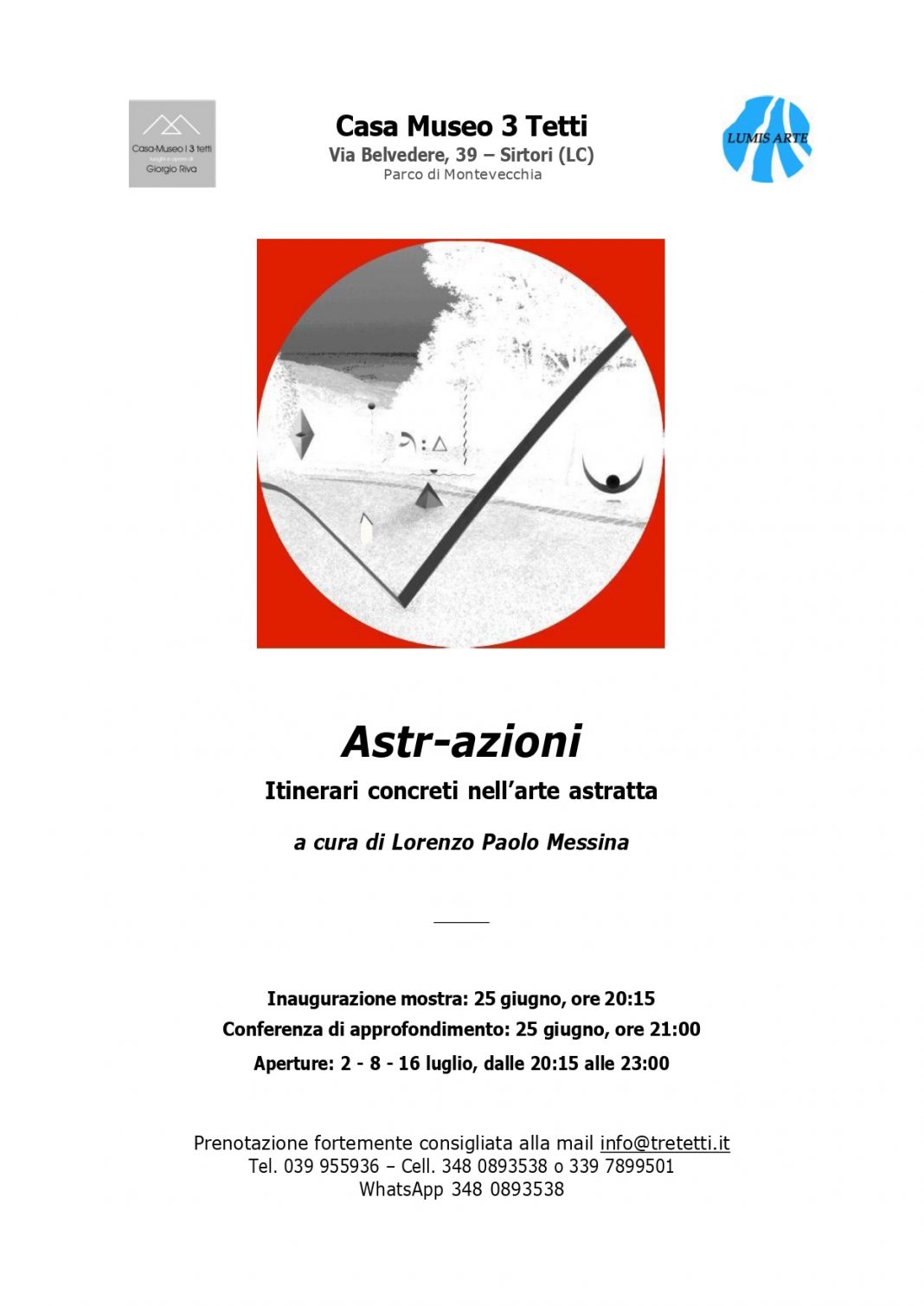 L’evento artistico Astr-azioni. Itinerari concreti nell’arte astratta nasce dalla decisione di Giorgio Riva, fondatore del Museo I 3 Tetti, di chiedere al curatore di Lumis Arte Lorenzo Paolo Messina di presentare un’occasione di riflessione sul rapporto tra l’arte astratta e informale nel suo museo. A questo fine sabato 25 giugno, alle ore 20:15, sarà inaugurata una mostra collettiva di arte astratta e informale, con opere di Mauro Bellucci, Mauro Benatti, Nicoletta Gatti, Gino Scagnetti, Elisa Veronelli e la partecipazione speciale di un’opera luminosa di Antonio Scaccabarozzi. Nella stessa serata, alle ore 21.00, verrà presentata una conferenza divulgativa, tenuta da Lorenzo Paolo Messina, che presenterà un itinerario estetico nella storia dell’arte astratta e informale.