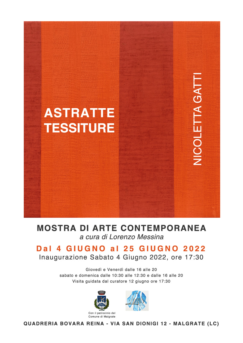 L’Associazione Culturale Lumis Arte, con il patrocinio del Comune di Malgrate, è lieta di presentare la mostra “Astratte Tessiture”, ideata per presentare nel territorio lecchese l’arte di Nicoletta Gatti (Tortona, 1959). La mostra presenterà le opere dell’artista attraverso un’inedita chiave di lettura, che permetterà di scoprire i sorprendenti legami delle sue opere astratte con l’arte della tessitura. L’apertura della mostra si terrà sabato 4 giugno, alle ore 17:30, all’interno della Quadreria di Malgrate. In quest’occasione sarà possibile incontrare la pittrice Nicoletta Gatti e il curatore della mostra Lorenzo Paolo Messina. La mostra sarà aperta il giovedì e il venerdì, dalle ore 16:00 alle 20:00, e il sabato e la domenica, dalle ore 10:30 alle 12:30 e dalle ore 16:00 alle 20:00.