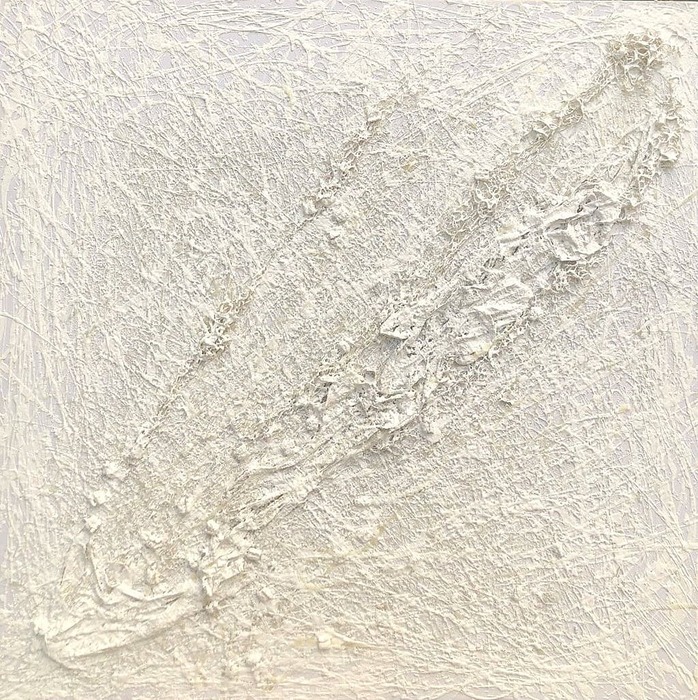 Con Maria Micaela Schiavi, il gesto pittorico diventa tramite di una sfida lanciata dall’artista all’inesorabilità del tempo, che da dimensione astratta si muta in realtà tangibile stratificandosi, attimo dopo attimo, sul supporto. È quella che Schiavi ha definito “Slow Painting Action”, ovvero una pittura che privilegia l’azione lenta, consapevole, controllata, per attribuire importanza ad ogni singolo istante che scandisce il processo creativo fissandolo definitivamente sul supporto. Questo spiega perché le opere selezione per la mostra appartengano ad un unico imponente ciclo – oltre cento dipinti – che l’artista ha realizzato nell’arco di dieci anni, accompagnando l’esecuzione pittorica alla stesura di un diario in cui ha documentato giorno per giorno sia i minuti di lavoro che i materiali impiegati – colore, gesso, colla, polistirolo – per ciascun quadro. Anche la scrittura – così come il formato quadrato comune a tutte le opere del ciclo concepite come moduli – diventa strumento di una processualità volta ad oggettivare il tempo, a renderlo “materia” che si deposita sulla tela, strato dopo strato, passaggio dopo passaggio, nell’unicità di attimi irripetibili. L’opera finale acquista perciò significato in quanto documentazione sia dell’azione che l’ha generata che del tempo impiegato a realizzarla, trasformando ogni gesto in un corpo “fisico” in cui il vissuto dell’artista si identifica con la materia pittorica. Tanto gli strati di colore quanto gli elementi in rilievo diventano reperti temporali che cristallizzano il divenire nell’immobilità del quadro, nel “silenzio assoluto” del bianco – così Schiavi lo definisce – che accoglie e custodisce l’azione pittorica come uno spazio puro, originario, un “vuoto” che in sé contiene ogni possibilità creativa.