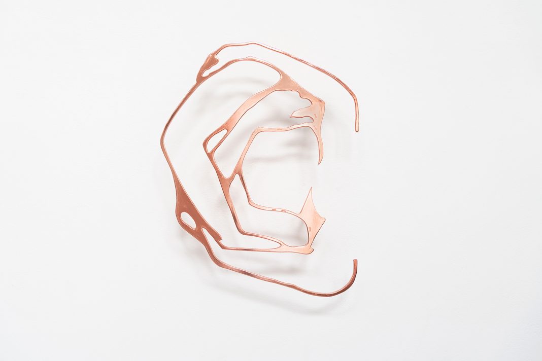 An Ear Of Arms (around you) – titolo della mostra allusivo a una delle opere presentate – evoca un orecchio composto da un intreccio di braccia, un insieme di forme che si pone in ascolto su un piano più empatico, piuttosto che sonoro. Ciò che ne scaturisce è un gesto avvolgente che si trasforma in un grande orecchio collettivo: metafora di una pratica dell’ascolto affettiva e condivisa. È a partire da questo cambio di paradigma che Argianas articola la mostra attraverso una serie di nuove opere: dal profilo forgiato in acciaio di un’erba selvatica, la Cichorium, alla scansione 3d della Pinna Nobilis – una creatura marina in via di estinzione – fino ad un guscio di tartaruga scansionato che allude ad un intreccio tra architetture. Opere che giocano con i limiti della scultura, fra citazione e rappresentazione, come il nastro di ottone che viene piegato fino a sembrare elastico e morbido, su cui l’artista ha inciso un testo, aprendo nuovamente lo spazio ad un livello altro, quello della lingua parlata – un’oggettività virtuale e immateriale.