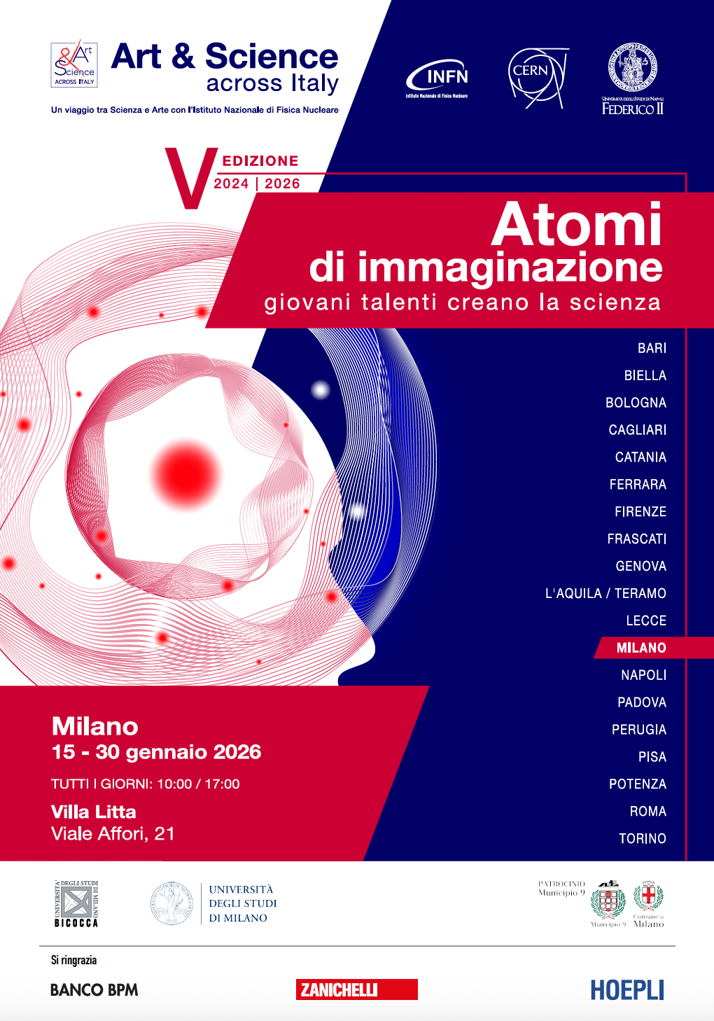 La mostra e’ realizzata nell’ambito del progetto Art&Science across Italy, promosso dall’INFN e dal CERN, in collaborazione con le università italiane. Il progetto si propone di avvicinare studentesse e studenti al mondo STEAM attraverso il linguaggio dell’arte.