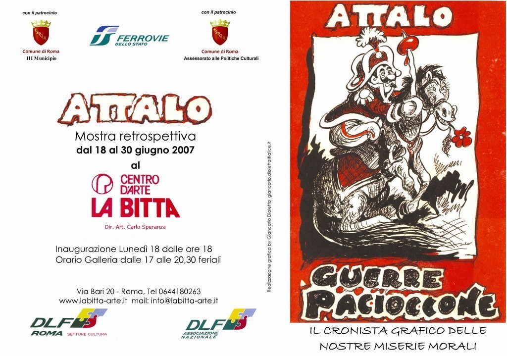 Le illustrazioni originali esposte al Centro d’Arte “La Bitta” sono state ordinate dal sottoscritto ad Attalo per conto di Adriano Dal Pont e Umberto Terracini, rispettivamente Segretario e Presidente dell’Associazione Perseguitati Politici per il volume “Anno X del regime – Starace dixit”. Era il 1968 – e per questo modo di illustrare le debolezze umane che Attalo si differenzia da tutti gli umoristi italiani e stranieri, diventando, come diceva Federico Fellini (collega di Attalo nel giornale “il Marc’Aurelio”), il primo, forse l’unico disegnatore neorealista italiano.