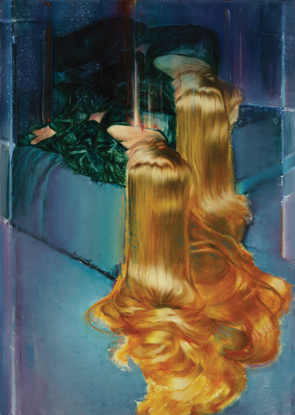 I capelli, lunghi fluenti, di matrice manrayana, con richiami preraffaelliti sembrano composti da uni stlylist glam, sono il soggetto principe di questi dipinti, i capelli infatti, raccolti o intrecciati o in fusioni di doppi, come in un confronto di identità, si muovono sinuosi nella pittura, trasfigurando la pittura stessa in onde di epifanie e, di estensioni.