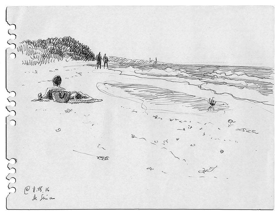 In un ciclo di disegni a penna, realizzati in modo estemporaneo, la costa meridionale della Sicilia e il mare, frontiera di spiagge battute dal vento e frontiera sulla quale stare ad ascoltare il mare e scrutare oltre l’orizzonte.